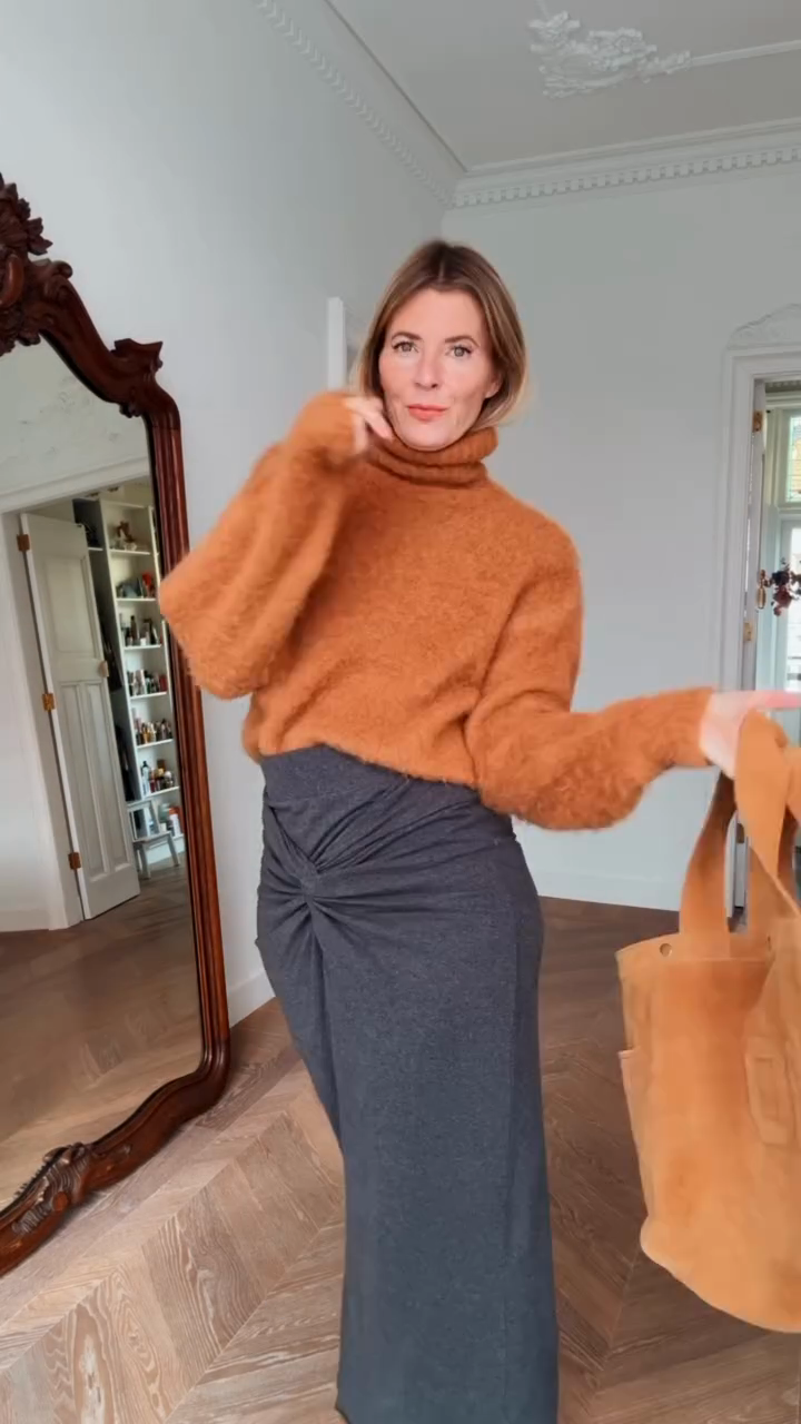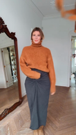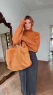 This orange turtleneck sweater is crafted from fluffy, soft fabric for a cozy and comfortable feel. The high collar provides extra warmth, perfect for cooler weather.