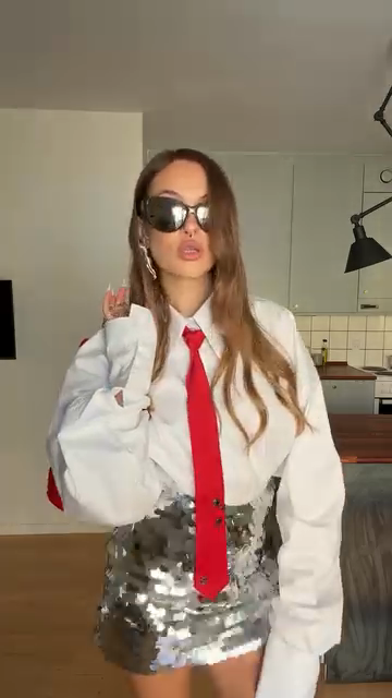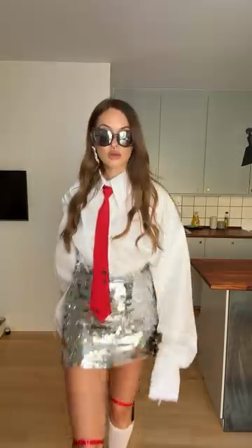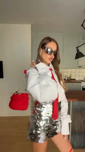 Oversized White Shirt with Red Accents and Sequin Skirt Set