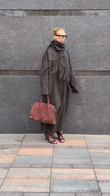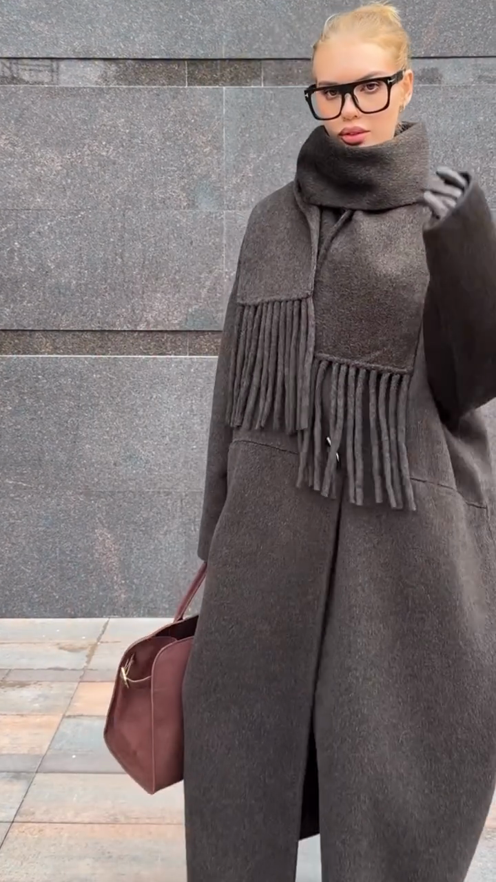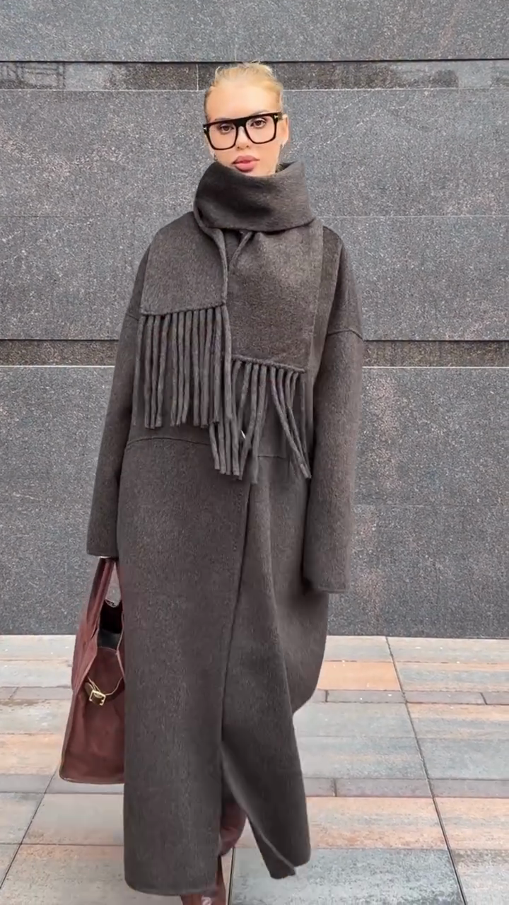 Oversized Wool Coat with Fringed Scarf