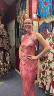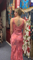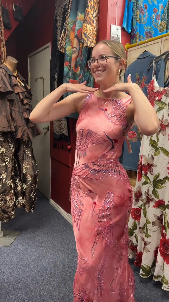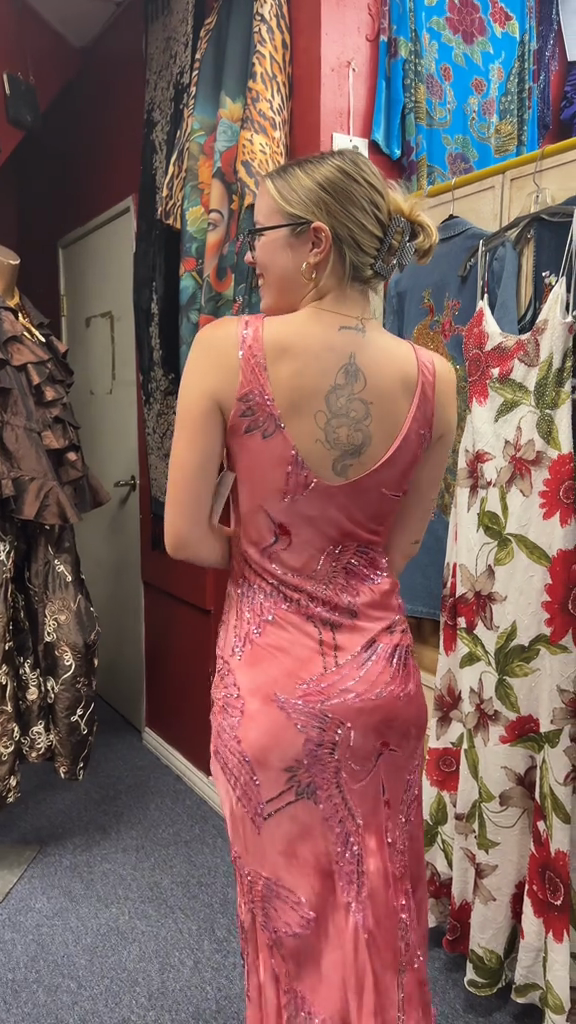 This pink evening gown features a sleeveless silhouette and a slim fit. Delicate bird embroidery and shimmering sequins add to the allure. The high neckline and strategic placement of the embroidery and sequins create a striking visual effect, making the gown particularly eye-catching.
