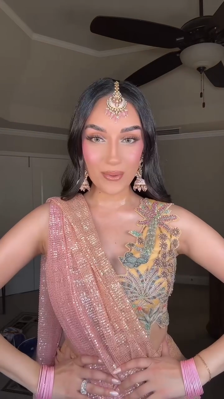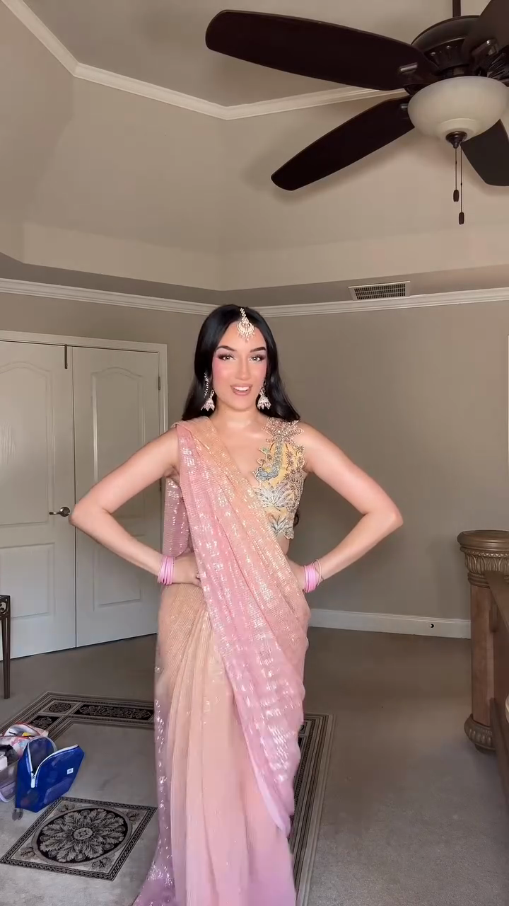 This pink sequined sari features ombré sequins and intricate embroidery on the bodice, showcasing the traditional sari silhouette. Pair it with embellished heels and Indian bridal jewelry for the perfect Indian formal wedding look.