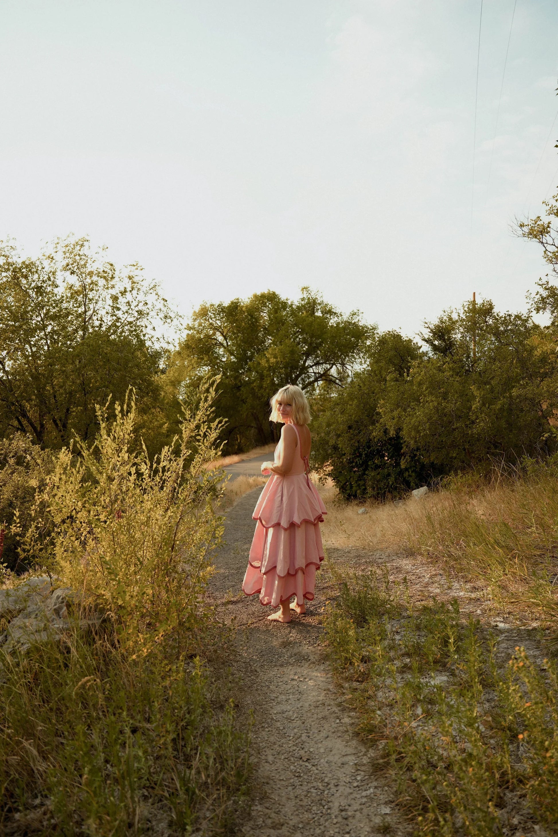 This pink midi dress features a tiered skirt with scalloped edges for a playful, feminine look. The sleeveless bodice and square neckline create a timeless, elegant silhouette, perfect for warm weather.