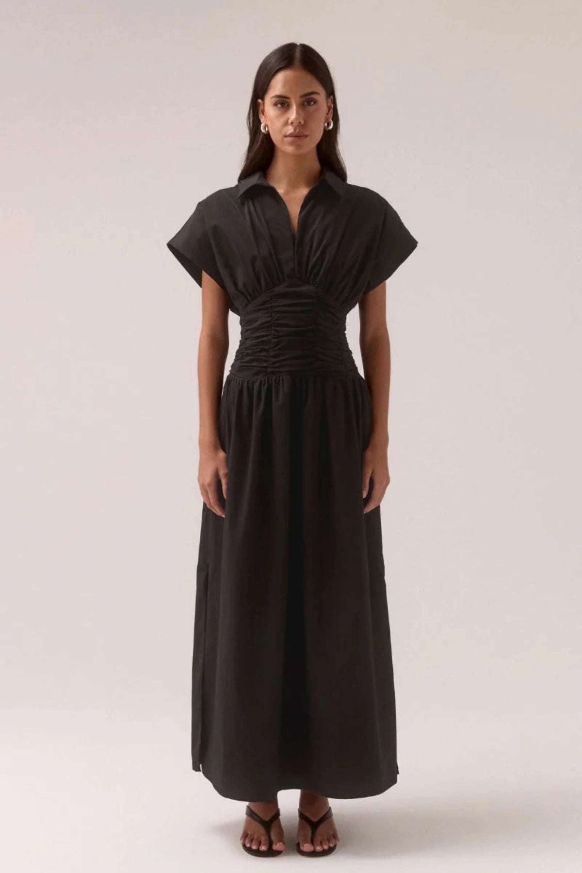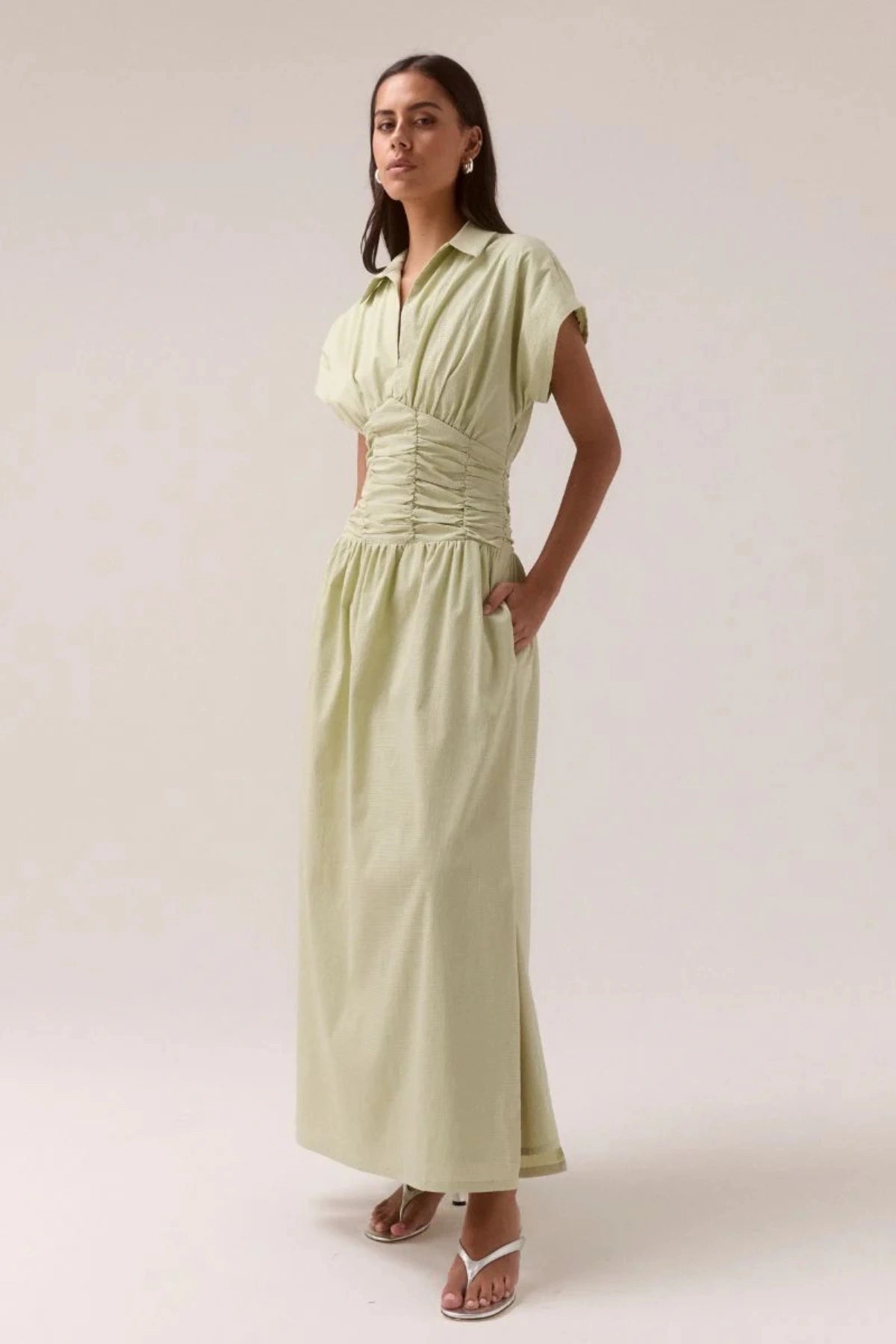 This maxi dress features a shirt-style neckline and V-neck for a refined, classic look. Ruching at the waist flatters the figure while maintaining a comfortable, fitted fit. Short, slightly puffed sleeves add a touch of femininity. Perfect for a variety of occasions, from casual outings to semi-formal events. Pair it with simple silver strappy sandals, as shown, for a chic and effortless look. Add statement jewelry or a belt to elevate the look.