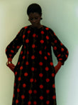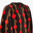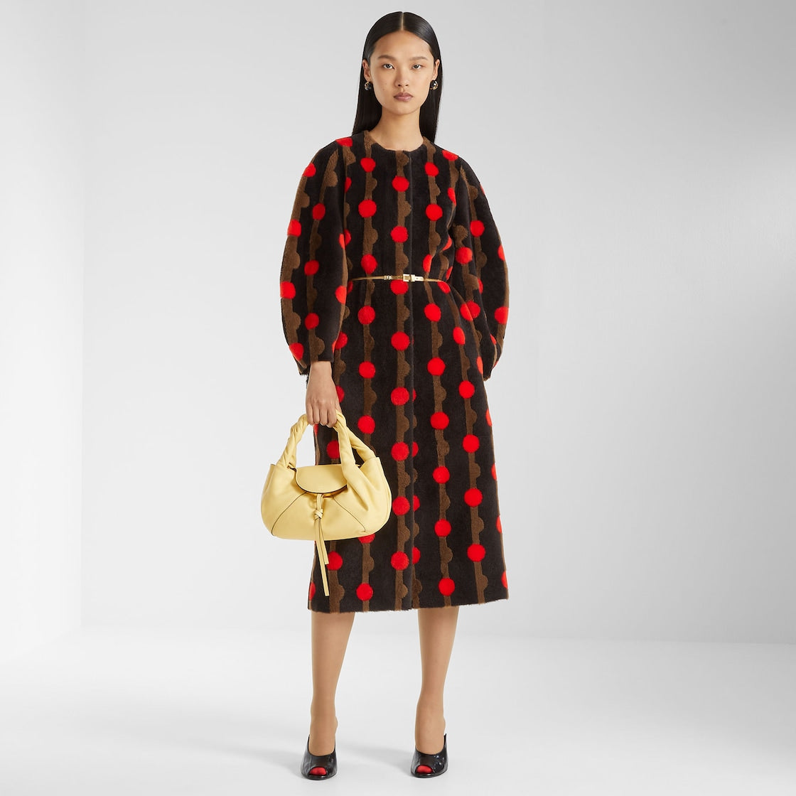 This coat features a striking polka-dot pattern in a dark brown base, accented with red dots for a striking visual contrast. Puff sleeves add a touch of fluffy elegance, while a gold belt cinches the waist for a stylish touch.