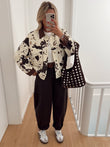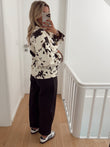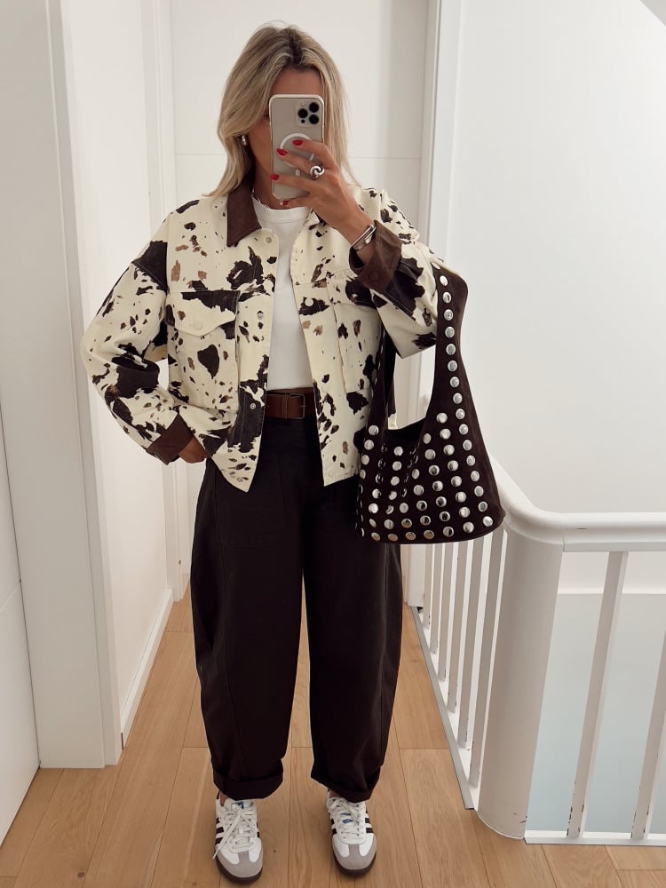 This jacket features a unique white and brown cow print, creating a bold and fashionable statement. The denim fabric and classic button closure add a casual, timeless touch. The brown collar and cuffs contrast beautifully with the print.