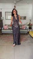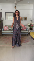 The printed sari paired with the embellished vest creates a perfect blend of traditional fashion and modern flair, making it an ideal choice for weddings, festivals, or cultural celebrations.