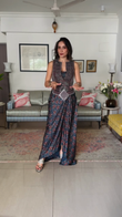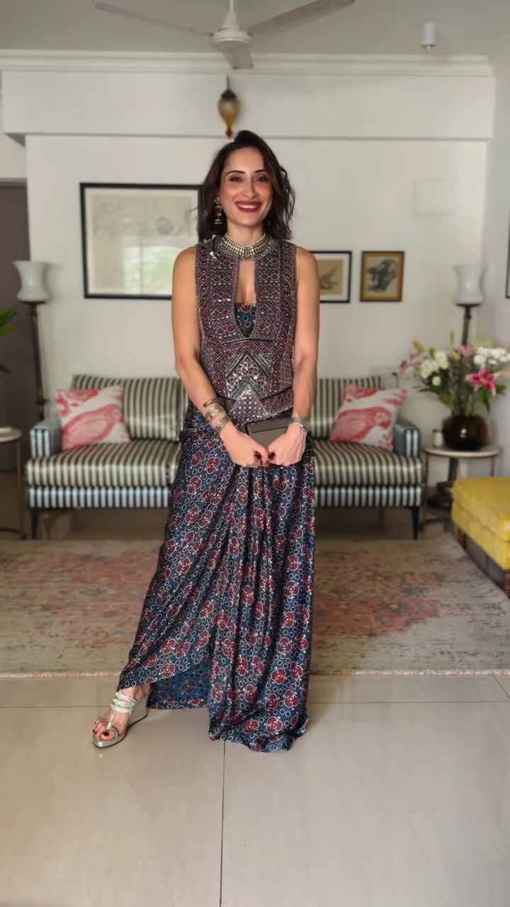 This ensemble features a printed sari with intricate blue and red patterns, showcasing traditional craftsmanship. A matching vest embellished with embroidery and sequins adds a touch of charm and cultural heritage. The overall look cleverly blends traditional Indian elements with a modern twist.
