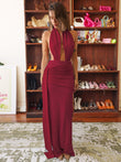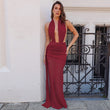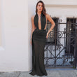 This maxi dress features a daring open back and a plunging V-neckline for added allure. The silky bodice creates a stunning contrast with the delicate lace at the skirt. Ruching at the waist accentuates the figure, while the flowing, elegant mermaid lace skirt elongates the legs. Ideal for formal occasions, red carpet moments, and exclusive evenings, this dress boasts exquisite craftsmanship and attention to detail, ensuring comfort while delivering a stunning look. The lace fabric is both delicate and durable, and the overall design exudes an air of elegance and sophistication.