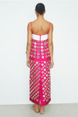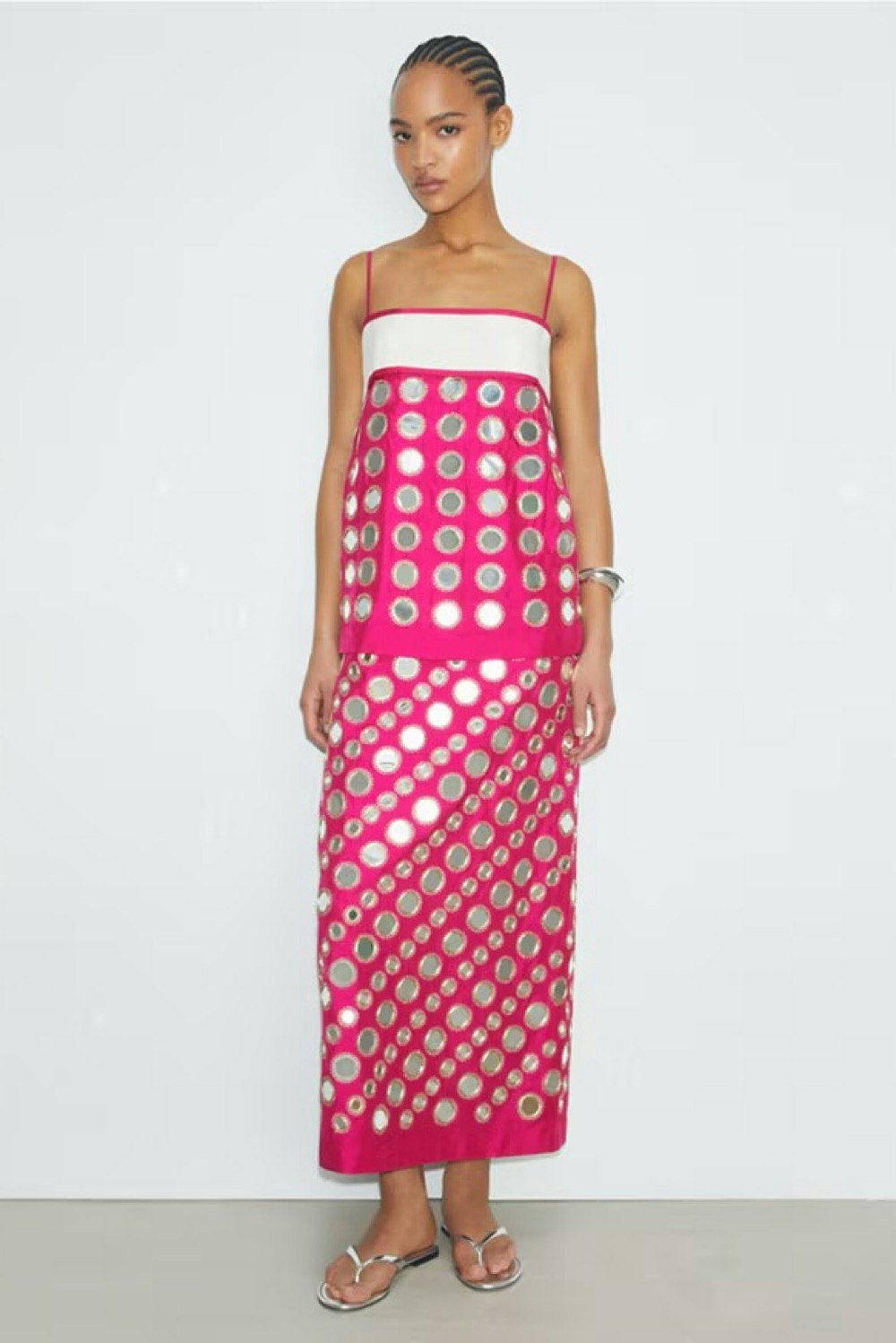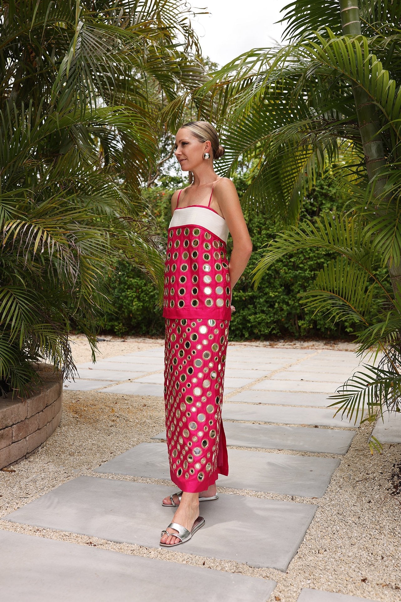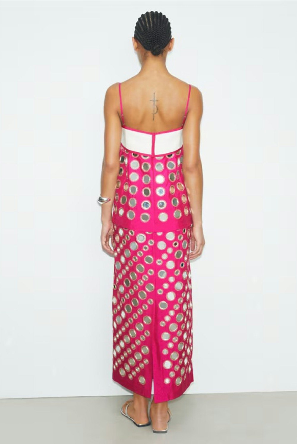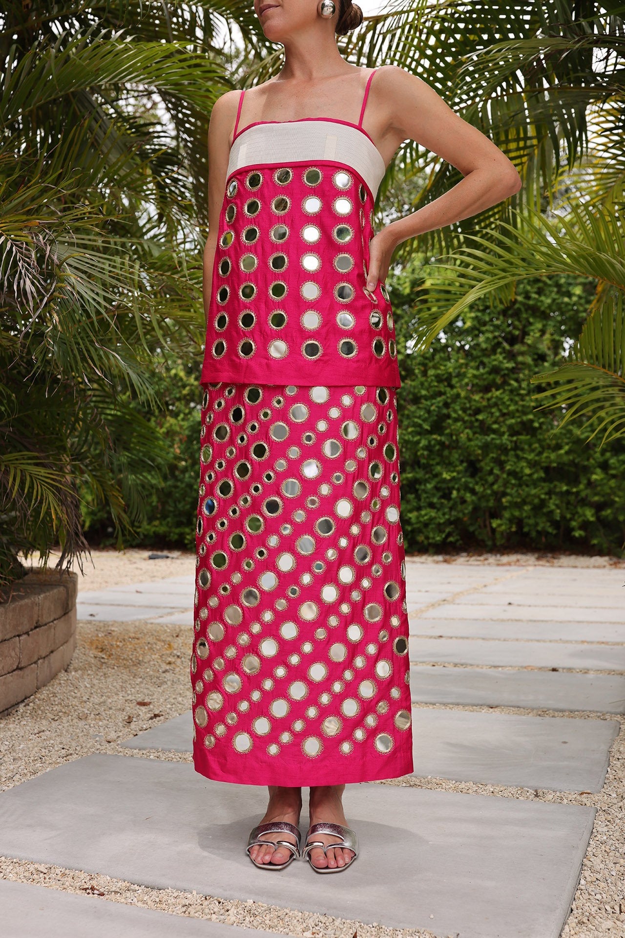 Crafted from fuchsia satin, this set features contrasting panels on the bodice and skirt, both embellished with mirrored details. Paired with metallic sandals and minimal jewelry, this fuchsia mirrored two-piece set will elevate your event look.
