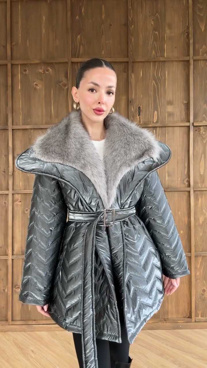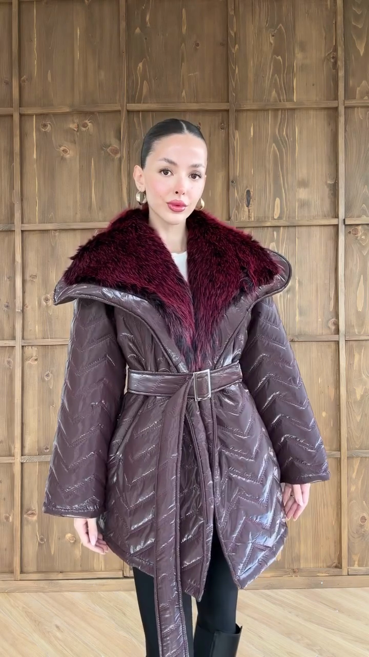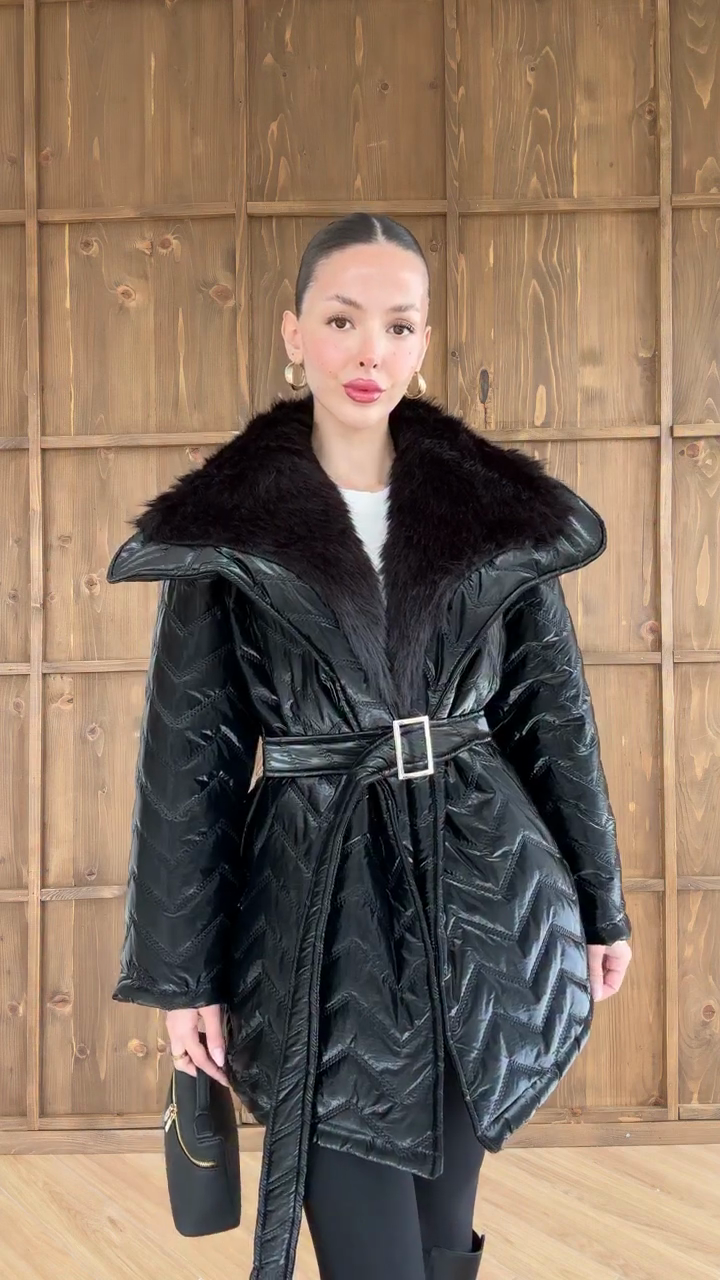 This quilted coat features a luxurious faux fur collar, adding a touch of luxury and warmth. The quilted pattern lends it a textured, modern feel, while the wide lapels and belt create a flattering silhouette.