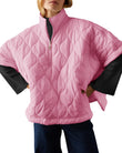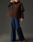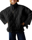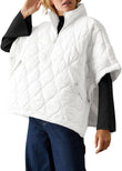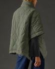 The individual is wearing an quilted jacket with a poncho - style cut. It features a high - neck design and a partial front zipper. The jacket has a loose, roomy fit, and the quilted pattern creates a textured appearance. Underneath, there's a black long - sleeved top, and the person is also wearing dark blue jeans. This jacket is suitable for casual wear, offering both style and warmth for cooler weather.