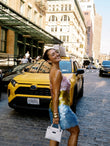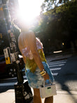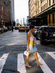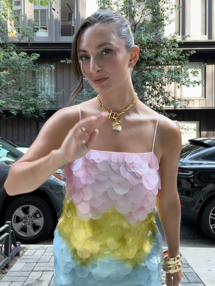 This mini dress is embellished with colorful sequins in a gradient pattern, from pink to yellow to blue. The scale-like sequins create a vibrant look that's sure to stand out in any crowd. The thin straps accentuate your shoulders and neckline, while the short length accentuates your legs. Perfect for a night out, a party, or any occasion where you want to add a touch of color and glamour, it's easy to style with a variety of accessories. As shown, it pairs perfectly with a simple white handbag and light pink block heels. Add statement jewelry to elevate the look.