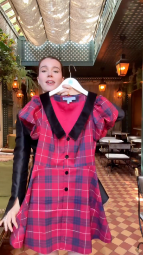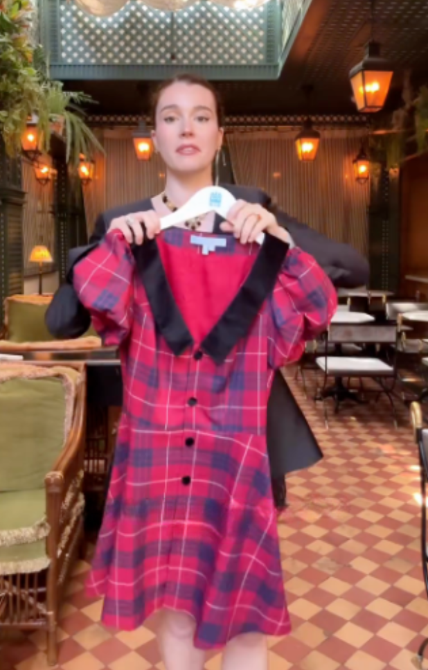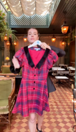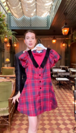 This mini dress features a vibrant red and blue check pattern for a lively and eye-catching look. Black velvet piping around the collar adds a touch of sophistication, creating a striking contrast against the vibrant check. The puff sleeves add a feminine and modern touch, while the button-down front adds a classic and versatile touch.