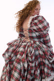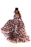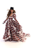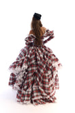 This ball gown features a classic red and white check pattern, exuding vintage charm. Its off-the-shoulder design, puff sleeves, and lace trim add a touch of romance and sophistication. The voluminous skirt creates a flattering silhouette, a hallmark of the traditional ball gown, perfect for formal or themed events.