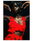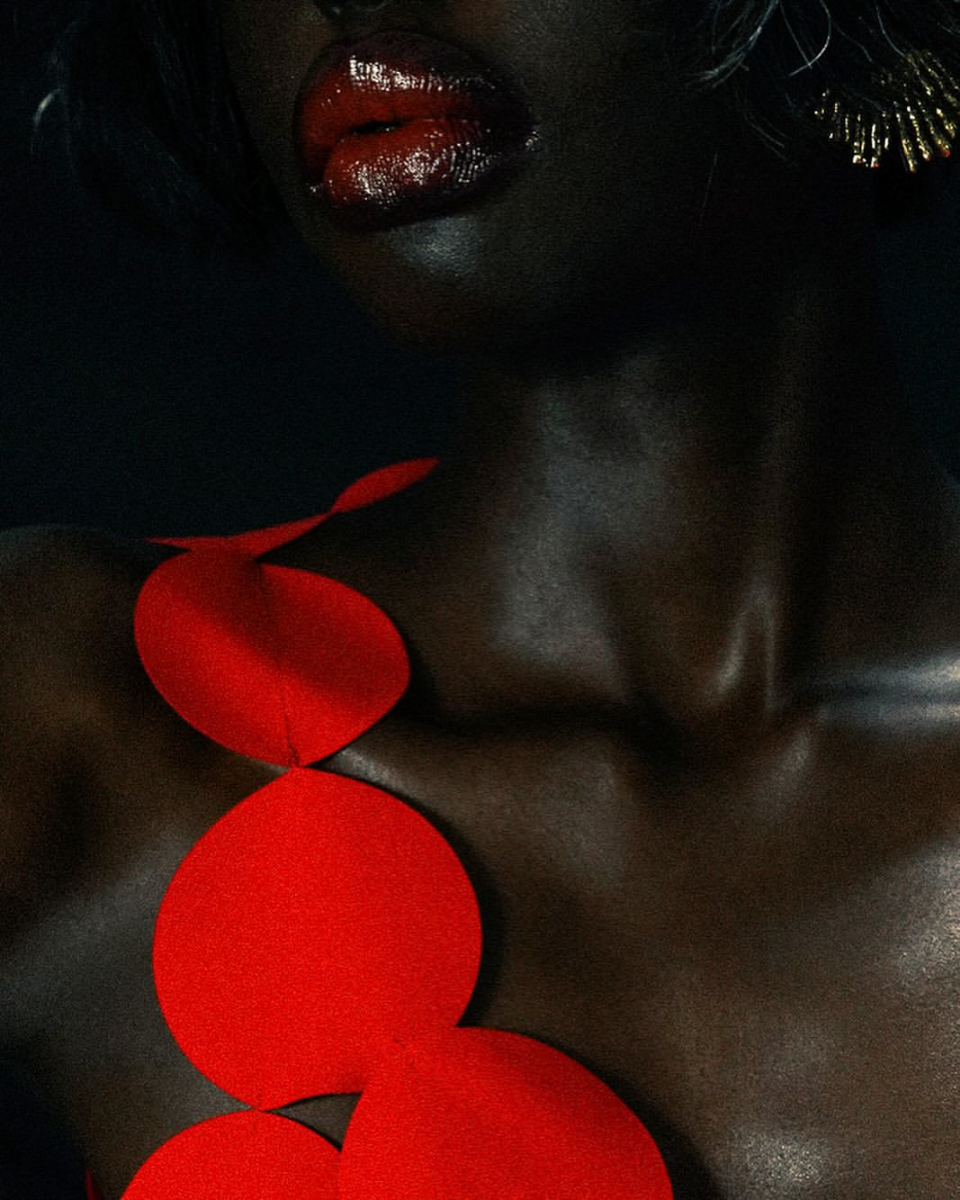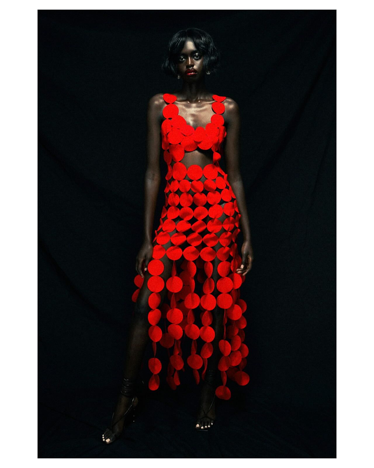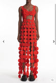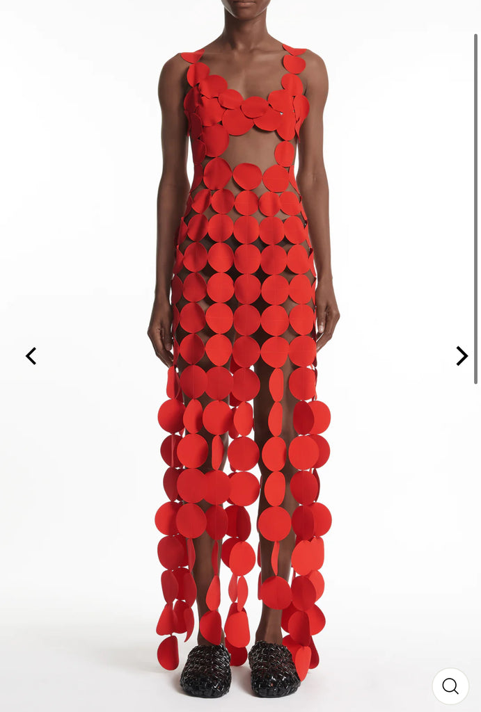 This dress stands out for its unique construction, composed of numerous red circular panels. The bodice features a flattering sweetheart neckline, with circular cutouts creating a semi-sheer effect. The panels cascade down the skirt, giving the dress a dynamic and fluid silhouette.
