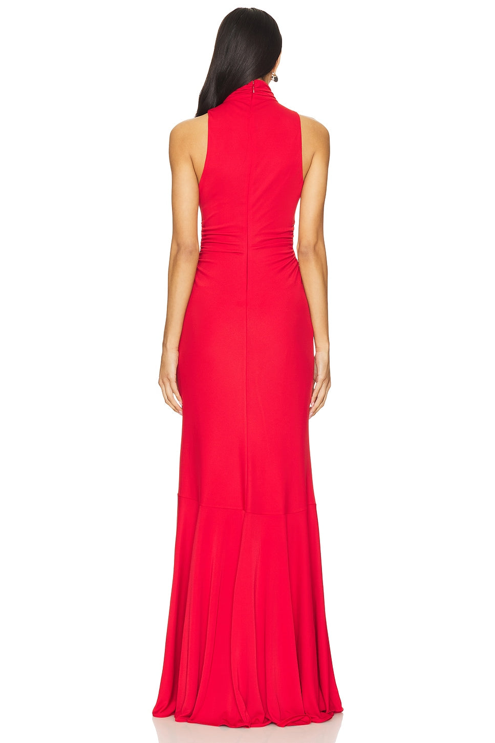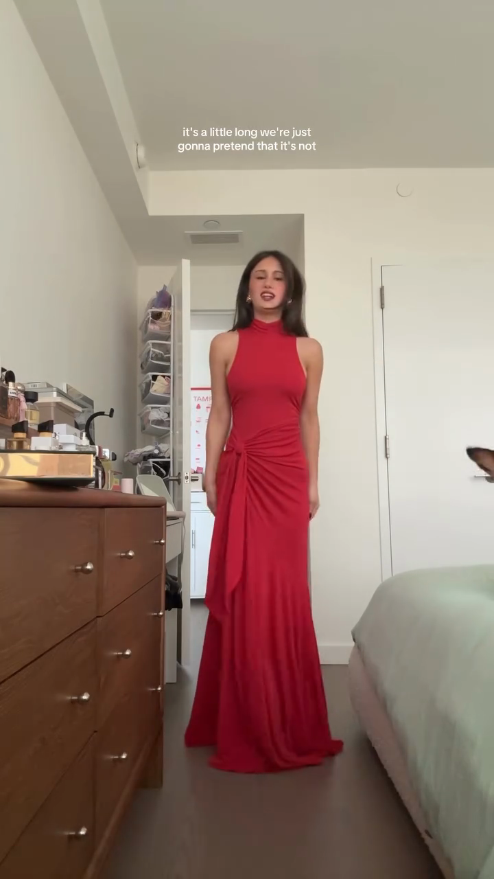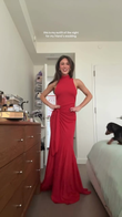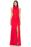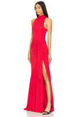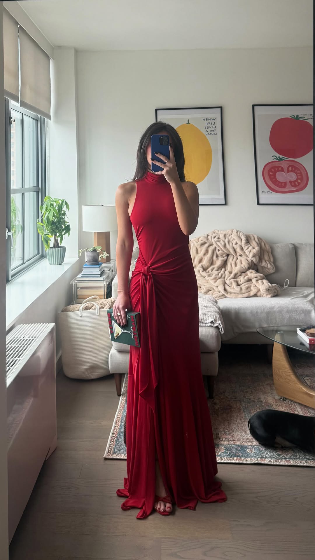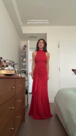 This red maxi dress, featuring a high neckline and sleeveless design, exudes sophistication and elegance. Ruched details at the waist create a flattering silhouette, while side slits add a touch of glamour and allow for ease of movement. The vibrant red color makes it a focal point for any special occasion.