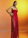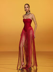 This red off-the-shoulder dress features a fitted silhouette with a flowing hem and fringe detailing. The high slit adds a touch of glamour and allows for ease of movement.