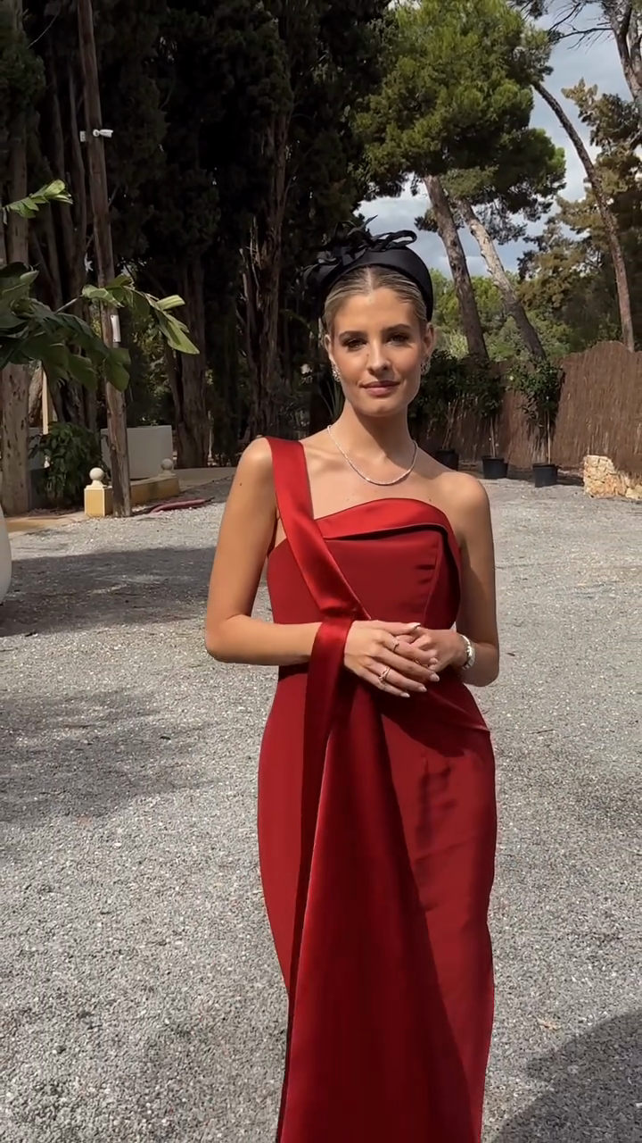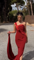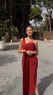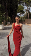 This red evening gown, with its striking one-shoulder design, exudes elegance and allure. The satin fabric adds a luxurious sheen, further enhancing the gown's allure. The elegantly draped flowing belt adds movement and drama to the look.