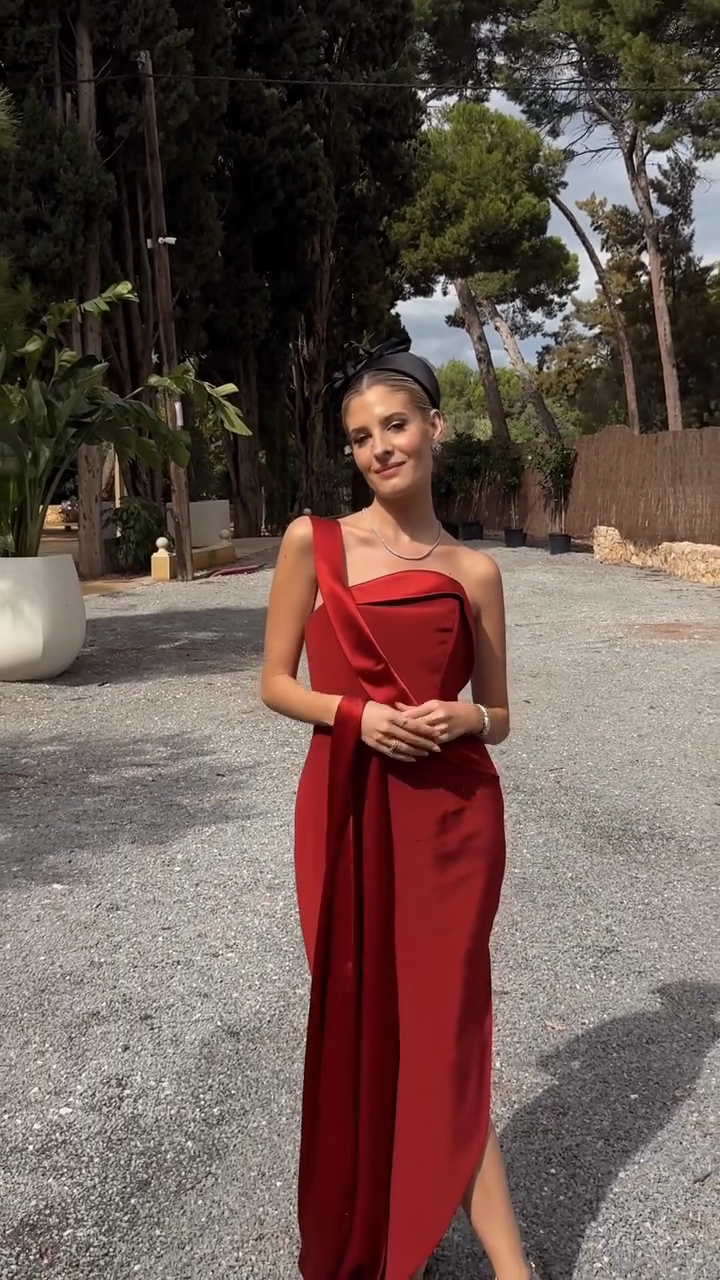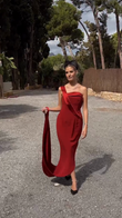 Perfect for red carpet events, galas, or high-end weddings, it exudes sophistication and elegance with striking jewelry and elegant heels. The vibrant red color and flowing silhouette make it the perfect choice for a memorable entrance.