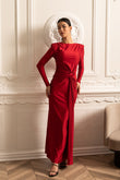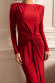 Style: Fitted long dress with long sleeves and a striking draped knot at the waist.
