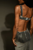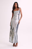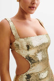 This shimmering sequined maxi dress is dazzling from every angle. Its square neckline, slender straps, and strategically placed side and back cutouts add a captivating, modern touch to the classic maxi silhouette.