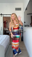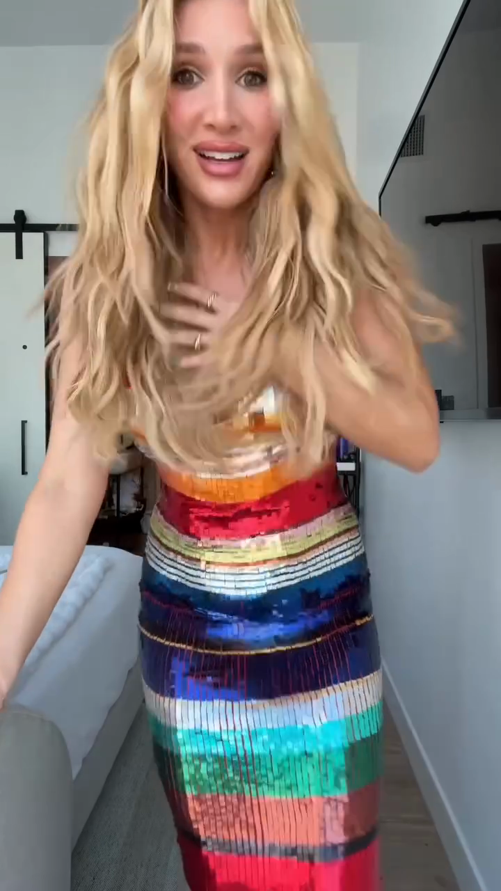 This stunning maxi dress, with its plunging V-neckline and slender straps, exudes an air of elegant sensuality. It's embellished with vibrant horizontal stripes in red, orange, blue, green, and silver, each crafted from shimmering sequins. These sequins shimmer in the light, making the dress dazzling from every angle. The slim fit hugs the body and reaches to the ankle for an elegant, elongated effect. Paired with simple silver lace-up sandals, it's the perfect choice for formal events, parties, or any occasion where you want to make a statement.