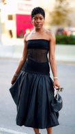 This stylish black ensemble features an off-the-shoulder top paired with a sheer midi skirt for added glamour. Pairing the flowing, elegant black midi skirt with black platform heels featuring lace-up details and a black handbag with metal handles completes the look. This outfit is both sophisticated and edgy, perfect for any social occasion.