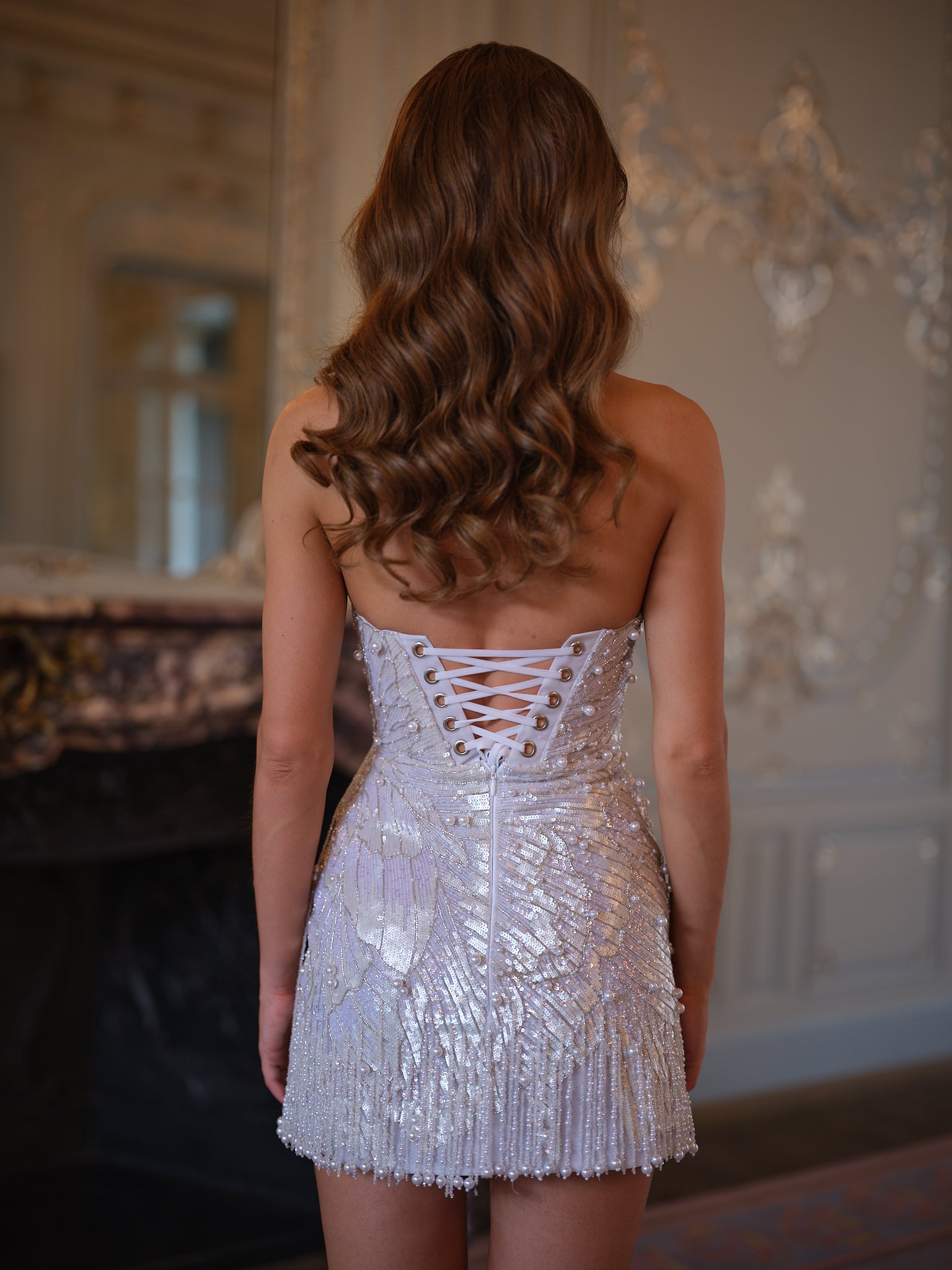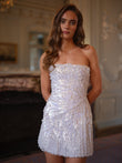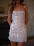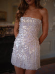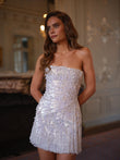 This mini dress is embellished with silver beaded sequins and features dazzling fringe at the hem. Pair it with metallic heels and diamond jewelry for a glamorous evening look.
