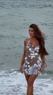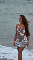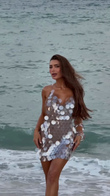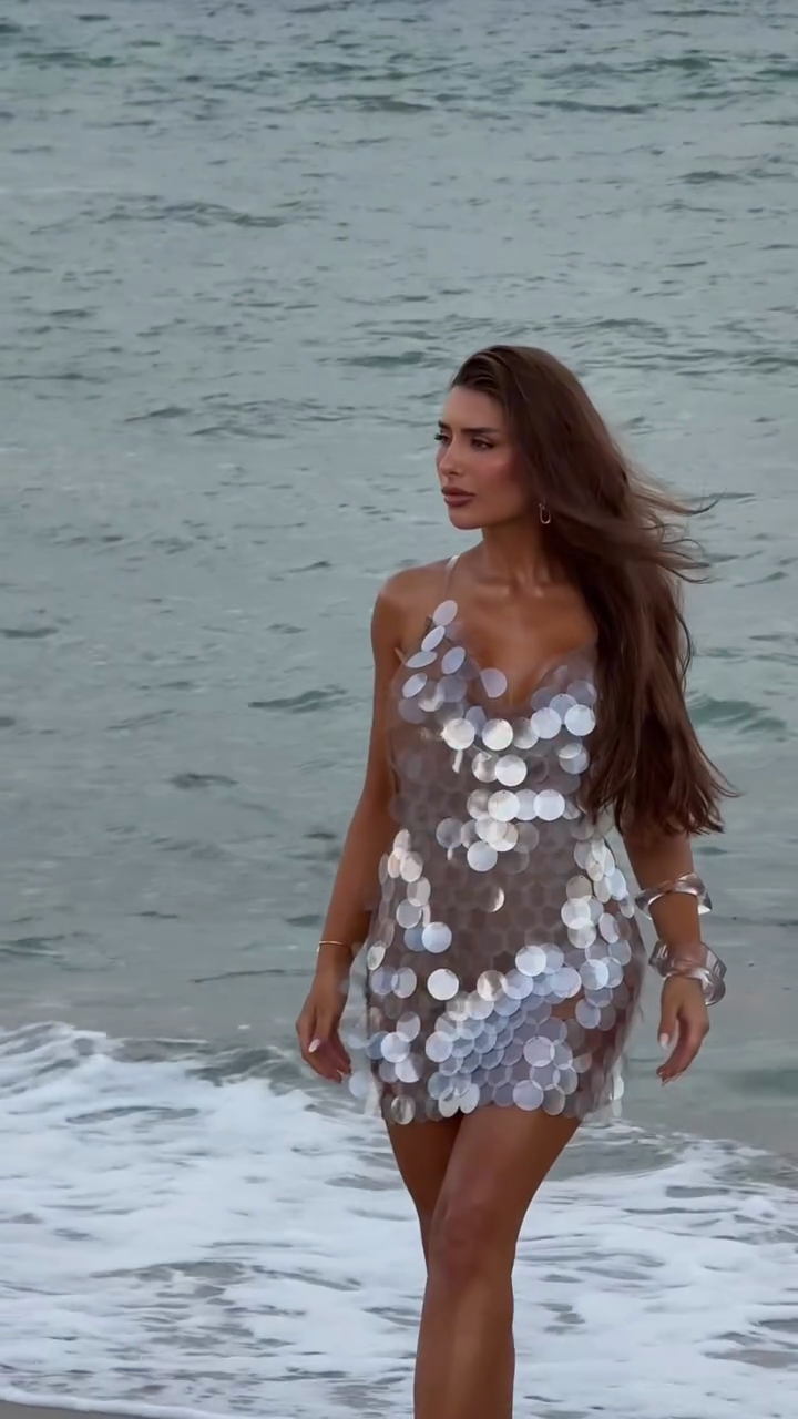 This silver tulle mini dress is crafted from lightweight silver mesh fabric and adorned with disc-shaped embellishments. Pair it with metallic sandals and eye-catching jewelry for a glamorous beach party look.