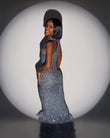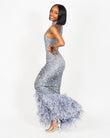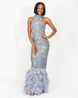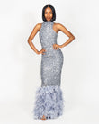 Silver Sequin Halter Maxi Dress with Feather Hem