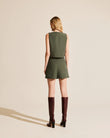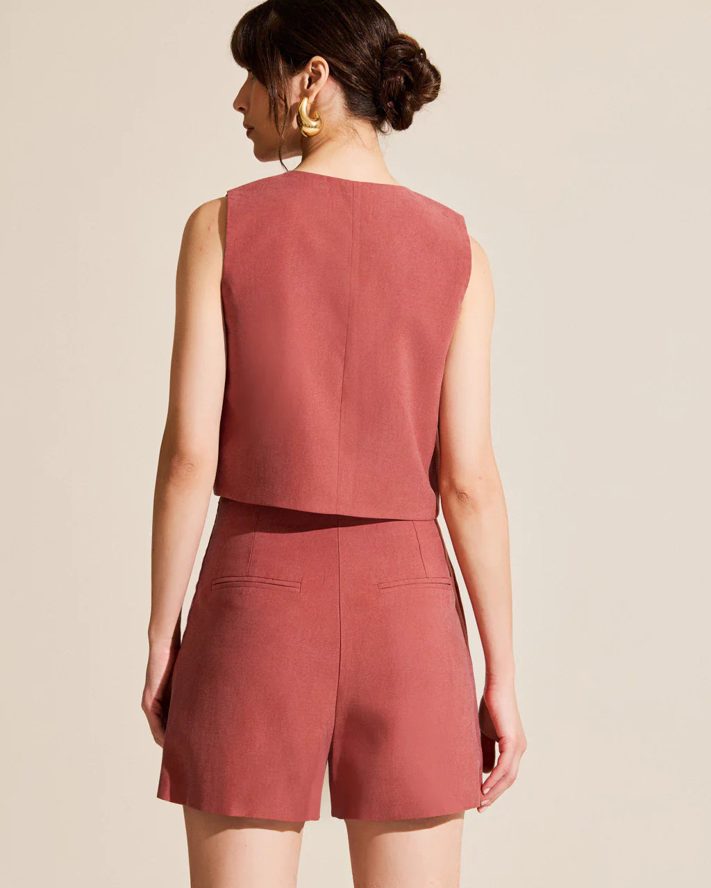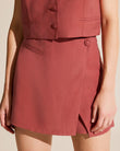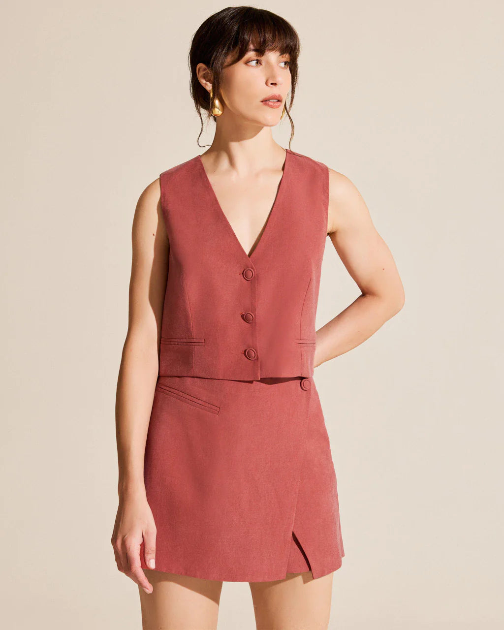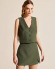 This two-piece set features a V-neck, sleeveless tank top with a button-front fastening, exuding a refined and elegant feel. The matching fitted skirt features side slits, adding a touch of elegance and femininity.