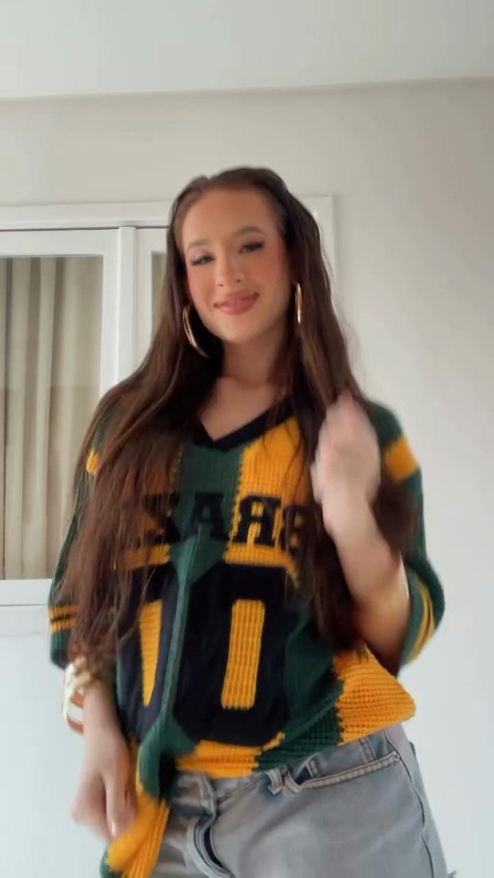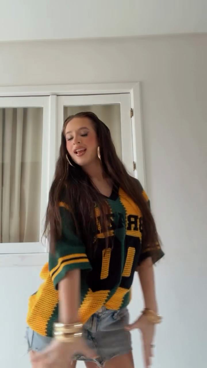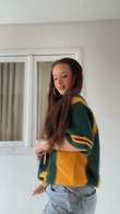 Sports - Inspired Sweater with green and yellow colors, featuring black lettering and the number "00". They've paired the sweater with light - wash denim shorts. Accessories include multiple gold bracelets and large hoop earrings. This outfit gives a casual, sporty - chic vibe, suitable for a relaxed day out, a sports event, or a casual hangout with friends.