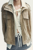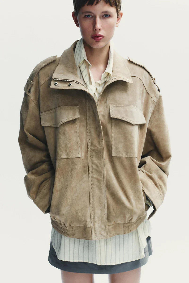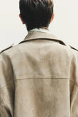 The jacket's relaxed, oversized fit allows for easy movement and layering. The fabric has a suede-like texture, feels soft, and is durable.