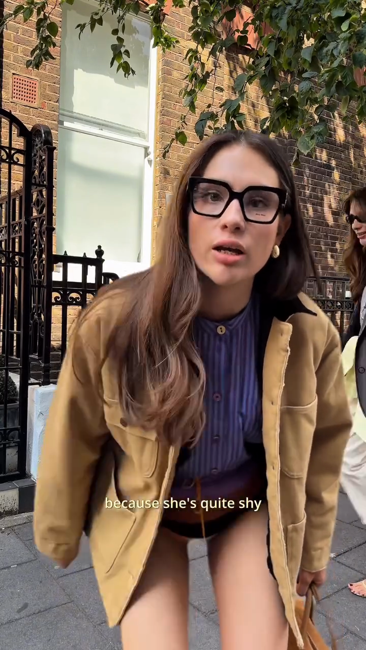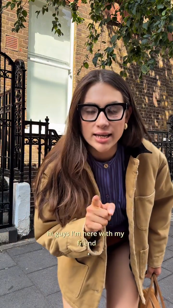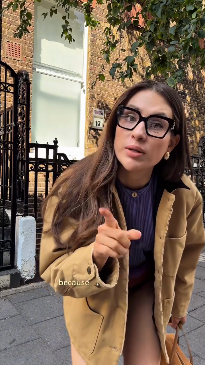 This tan utility - style jacket features a classic design with button - up closures on the sleeves and multiple front pockets, giving it a practical yet stylish look. It's worn over a purple striped top. Paired with large black - framed glasses, gold hoop earrings, and a brown handbag, the outfit exudes a casual, trendy vibe, suitable for everyday wear or a casual day out in an urban setting.