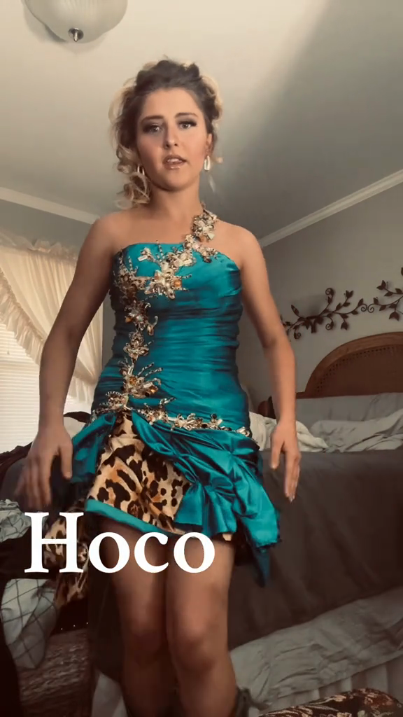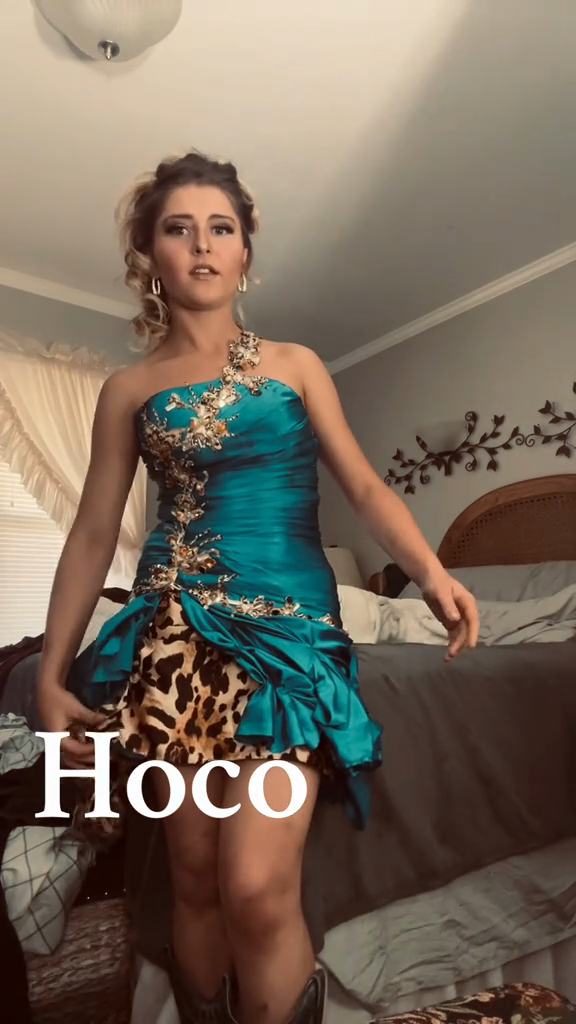 This dress features a vibrant teal hue, accented with delicate gold and beige embellishments for added charm. The fitted bodice is flattering, while the skirt is detailed with playful ruffles. Leopard print panels at the hem create a bold, contrasting color, making the dress stand out.