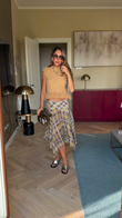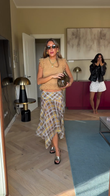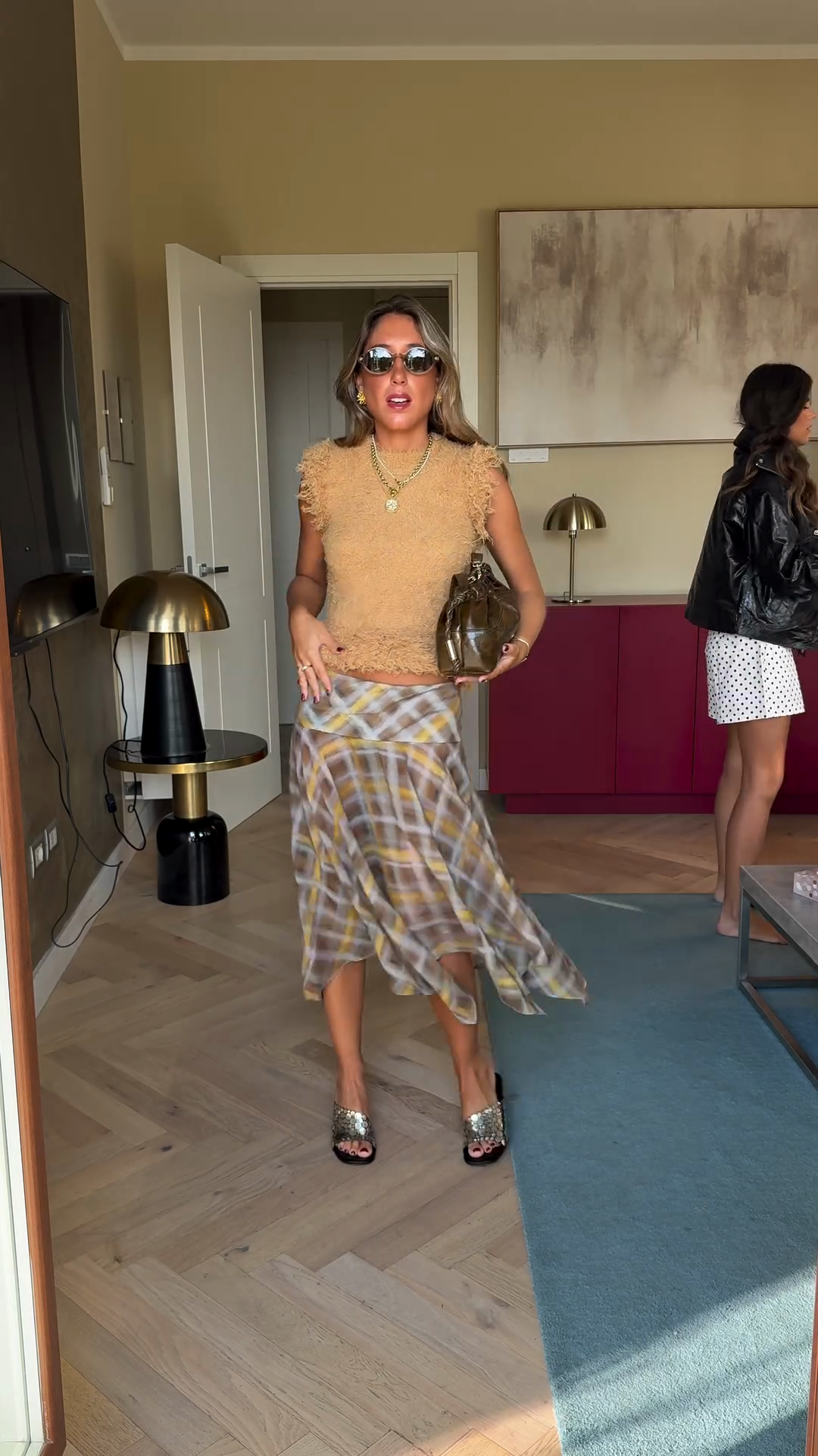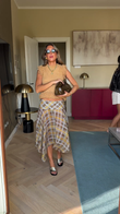This ensemble features a textured camel sleeveless top with a fringed hem for added texture and visual interest. The matching plaid asymmetrical skirt blends neutral tones with yellow accents for a vibrant and stylish look.