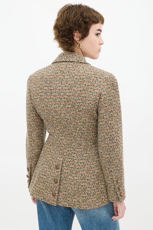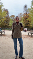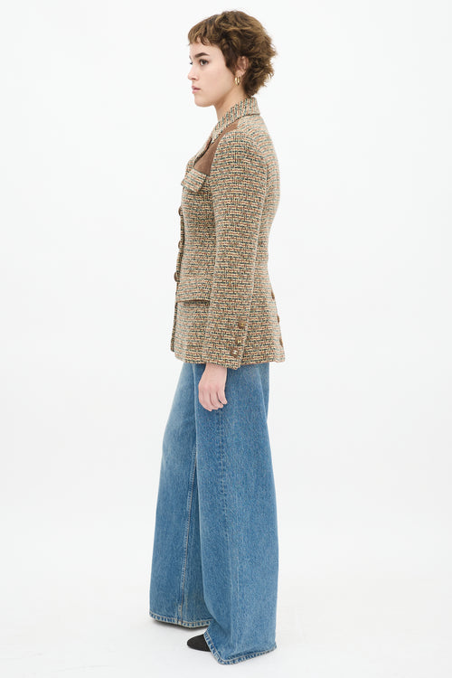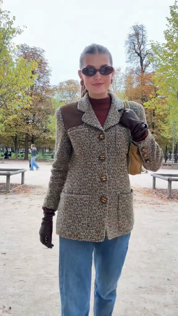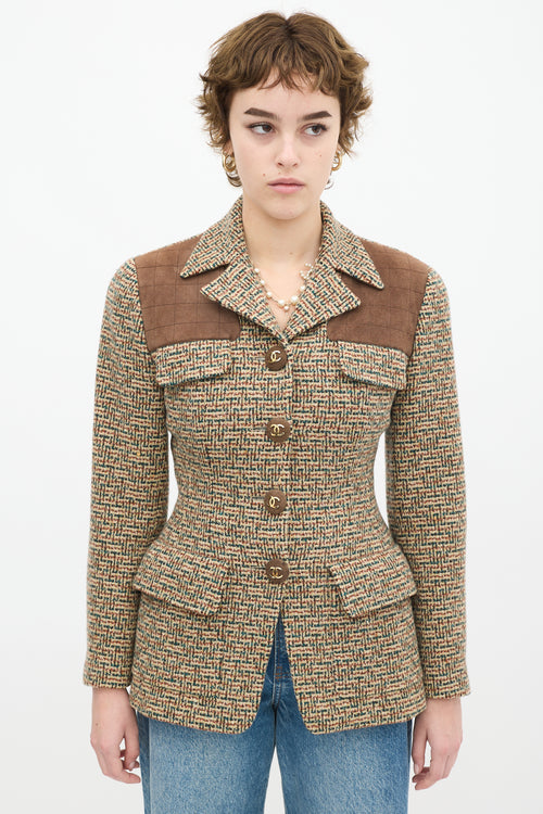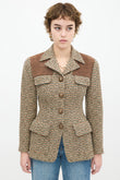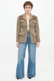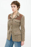 This blazer features classic tweed in earthy tones for a timeless, sophisticated look. Suede patches on the shoulders and collar add texture and a vintage touch, elevating the overall aesthetic.