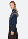 Design: Fair Isle pattern, asymmetrical color blocking and puff sleeves