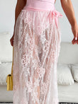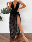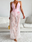 This maxi dress features a plunging V-neck for added dimension. The bodice is crafted from a smooth, form-fitting fabric, while the skirt is accented with delicate floral lace. The waist tie cinches the silhouette for a feminine touch. The high slit at the lace hem creates a flowing, elongated silhouette, allowing for ease of movement and a slightly longer silhouette. It's perfect for summer parties, beach weddings, or other semi-formal outdoor events. As shown, accessorize with a stylish, compact handbag for an elegant touch. Accessorize with simple jewelry and strappy sandals for a chic and refined look.