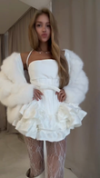 This white mini dress features a halterneck design and a nipped-in waist, flattering an hourglass figure. The hem is accented with fluffy ruffles for a playful yet feminine look. The overall design exudes a luxurious, high-fashion vibe.