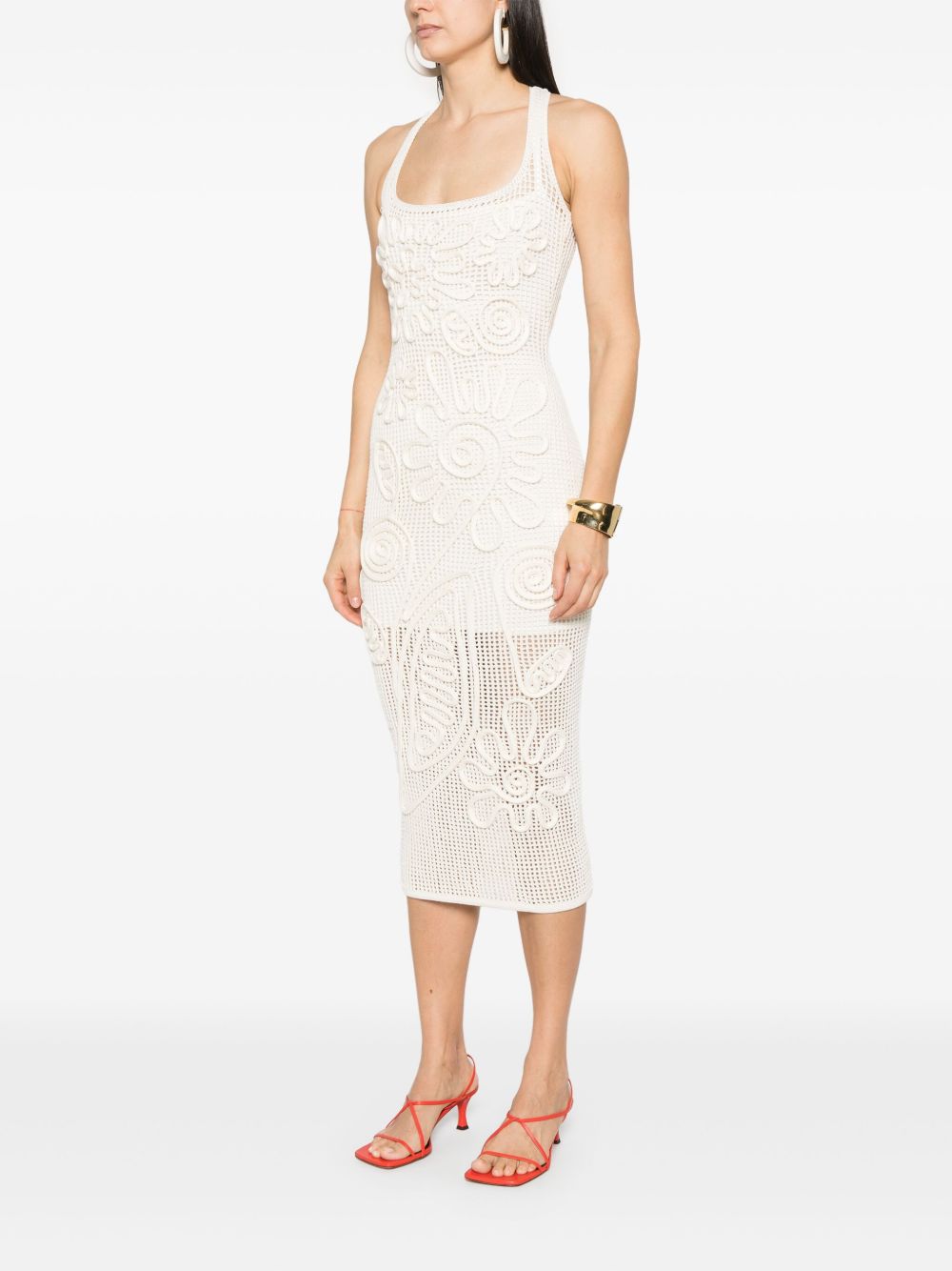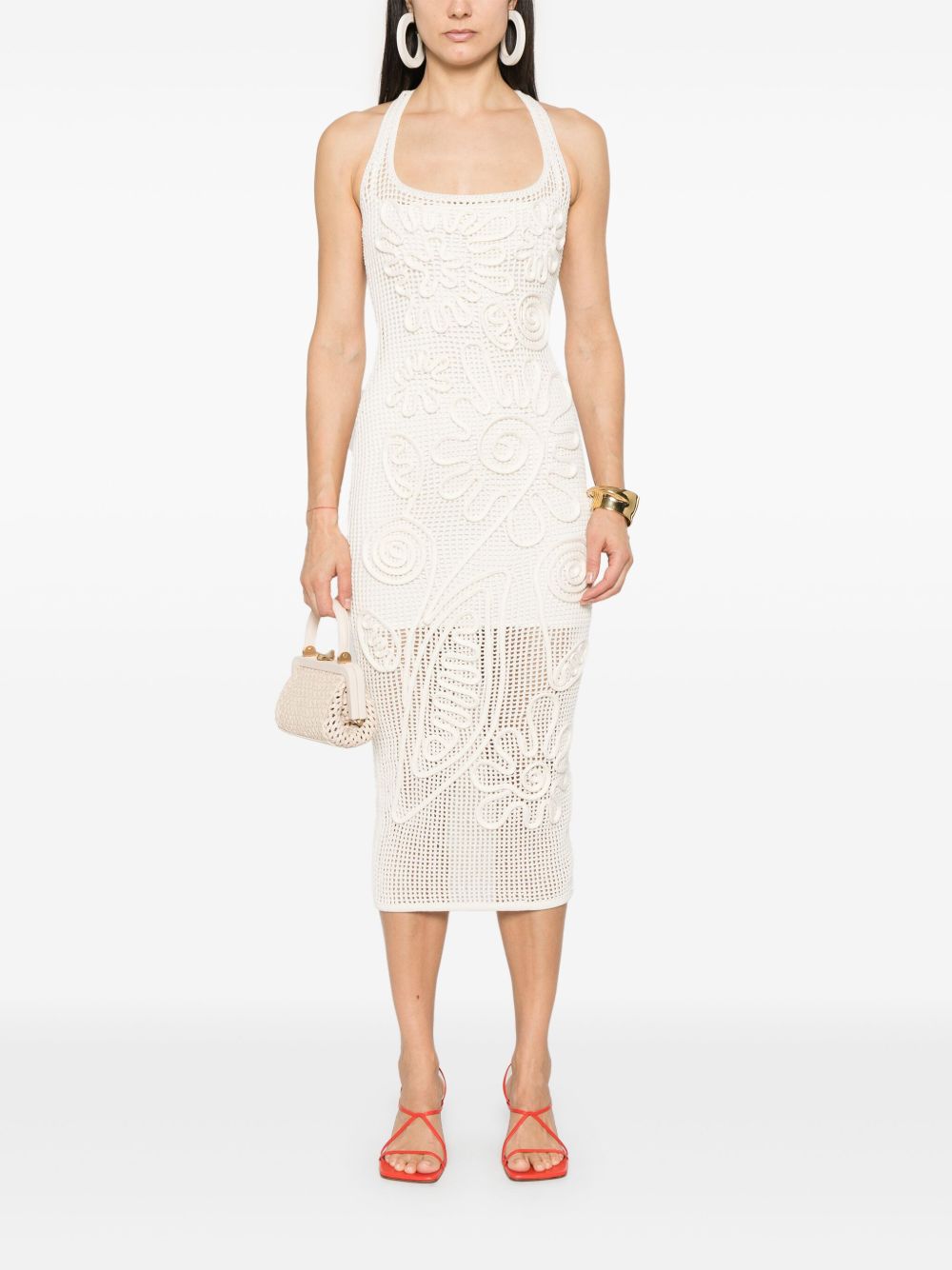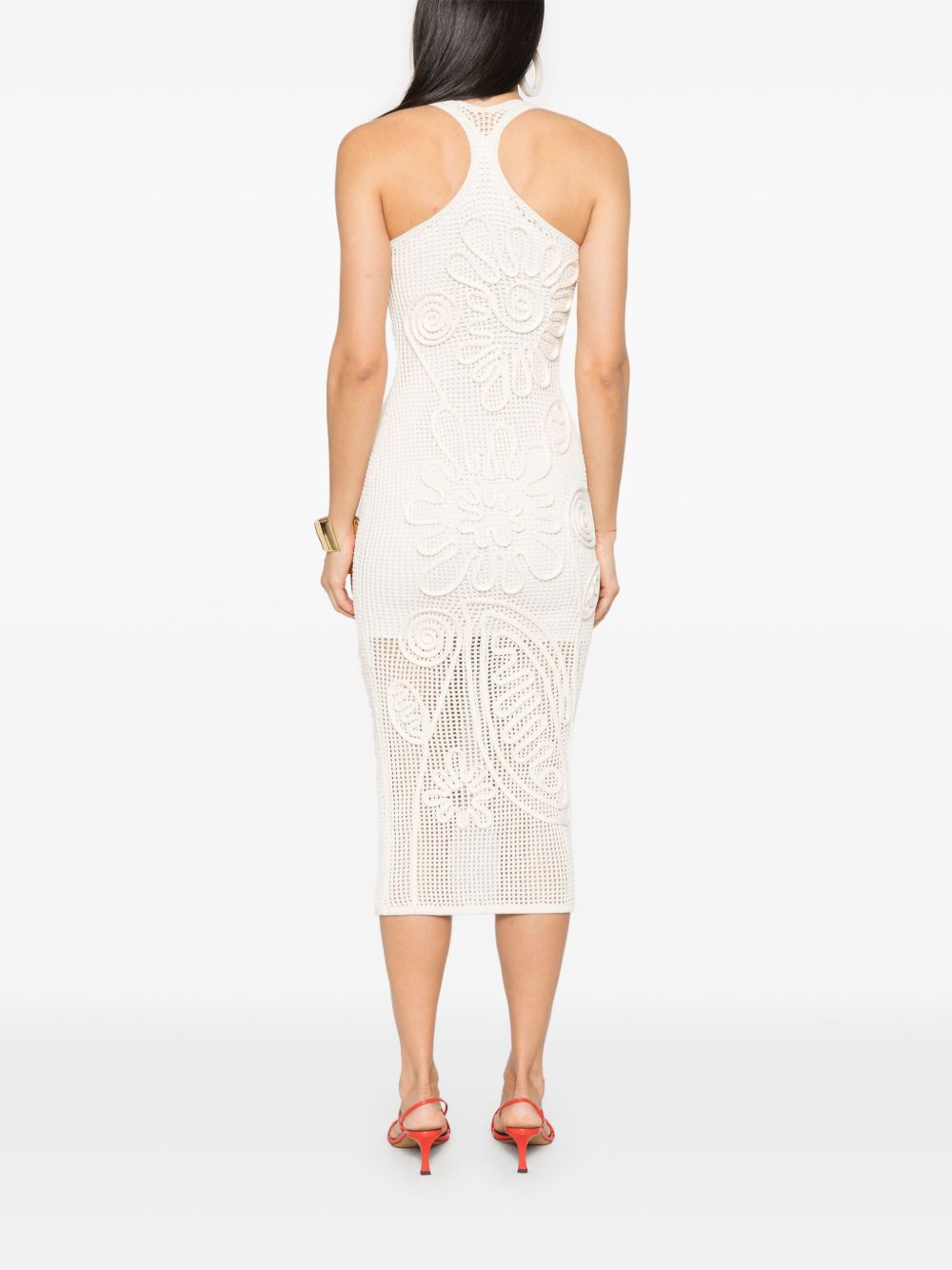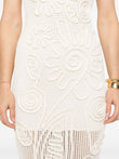 This white midi dress is crafted from delicate crochet fabric with an open back that accentuates the shoulders. Embellished with raised floral and paisley patterns, it creates a sophisticated and textured look. The fitted silhouette flatters the feminine figure, while the midi length adds an elegant touch.