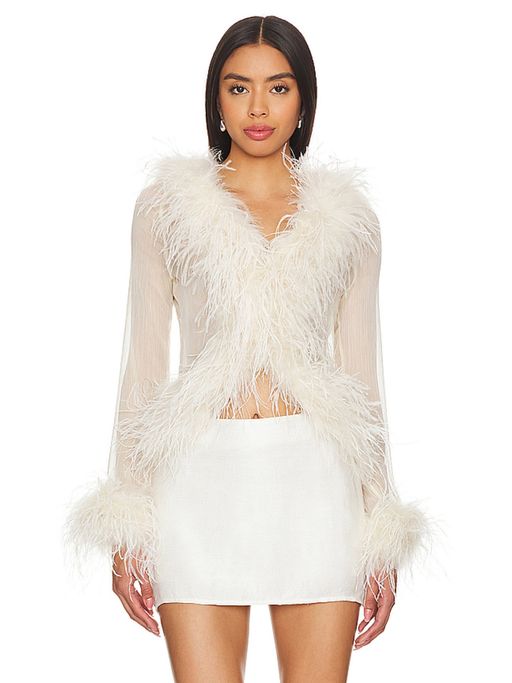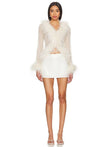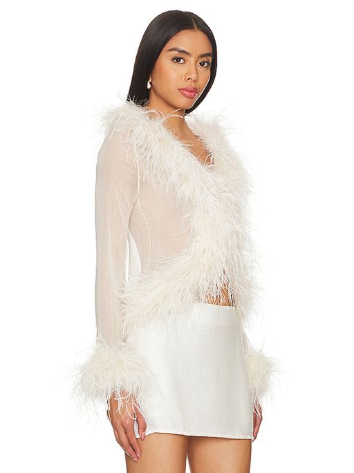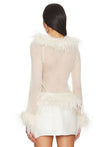 The top is a long - sleeved, sheer garment adorned with an abundance of white feathers, creating a dramatic and luxurious look. It has a V - neckline and the feathers are prominently featured around the neckline, chest, and cuffs. This eye - catching piece pairs well with the simple white mini skirt, making it suitable for upscale events, parties, or red - carpet occasions where a statement - making outfit is desired.