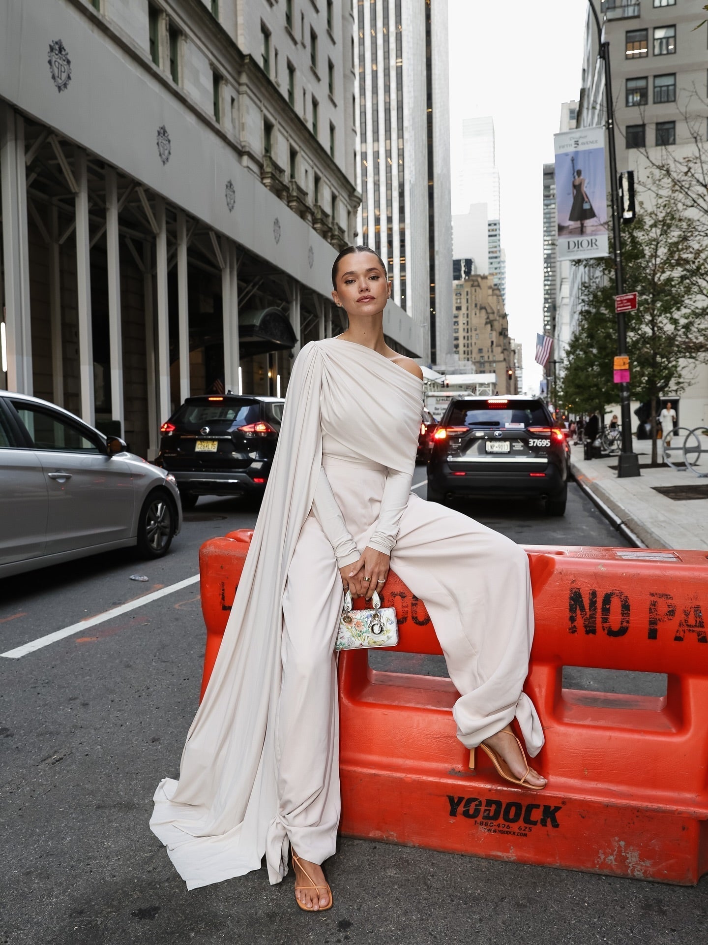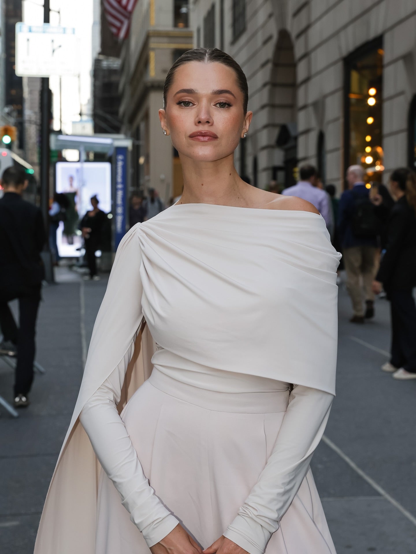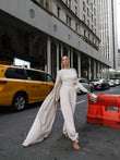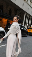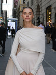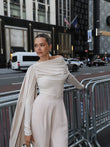 White off-shoulder cape suit