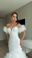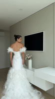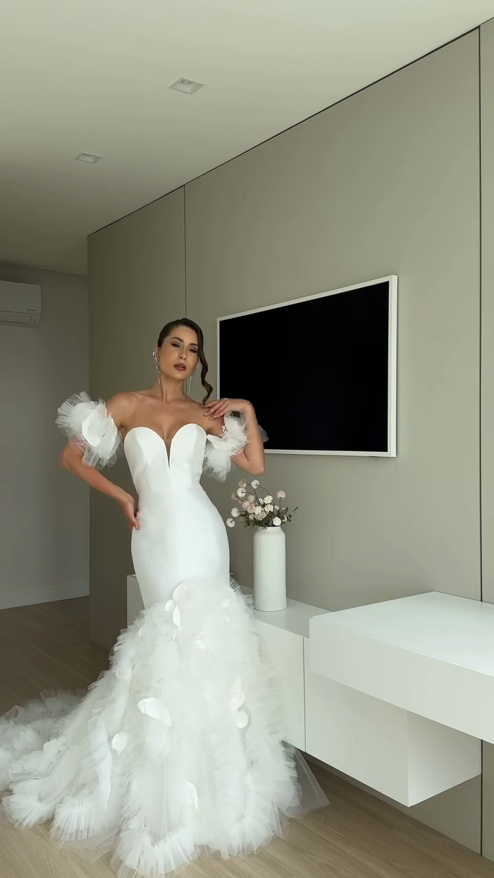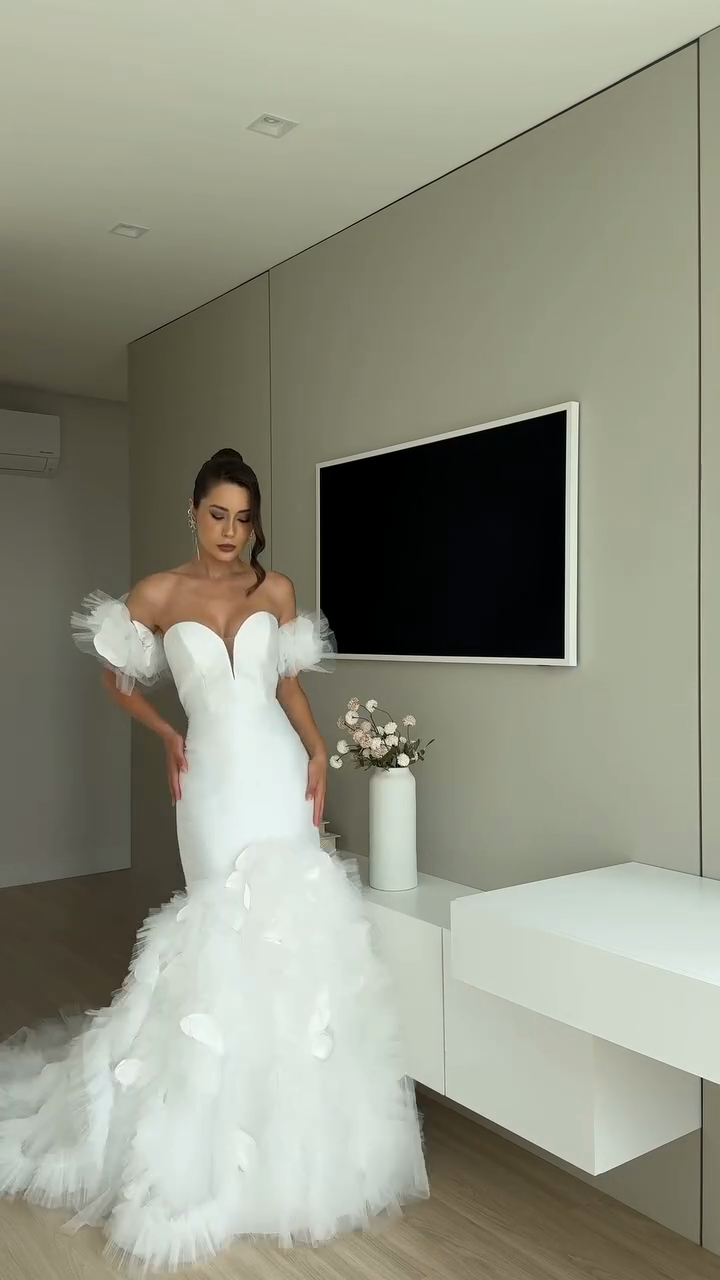 This white, off-the-shoulder mermaid wedding dress is crafted from white satin and tulle, featuring voluminous tulle sleeves, a deep V-neck, and a flowing tulle train adorned with three-dimensional flowers. Pair it with exquisite pearl jewelry for a perfect wedding look.