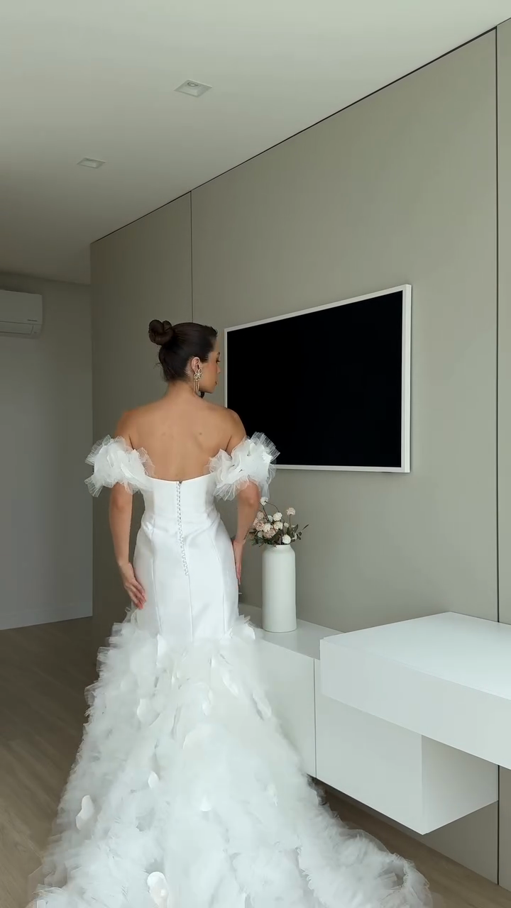 Design: Off-the-shoulder neckline, puffy tulle sleeves, deep V-neck, flowing tulle mermaid skirt adorned with 3D flowers