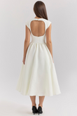 This white midi dress exudes elegance with a sleek, fitted bodice, short sleeves, and a high neckline. Its striking detail, the open back with keyhole cutouts, adds a touch of glamour and a modern twist to the classic silhouette. The skirt flares into an A-line shape, creating an elegant and feminine look.