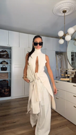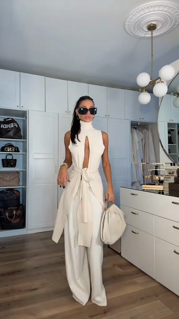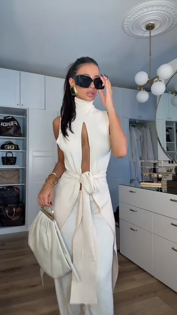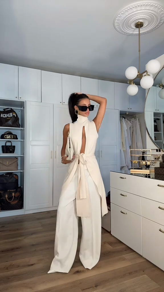 This white ensemble features a high-necked sleeveless top with a bold chest cutout and wide-leg pants. The waist tie adds a stylish touch and frames the figure.