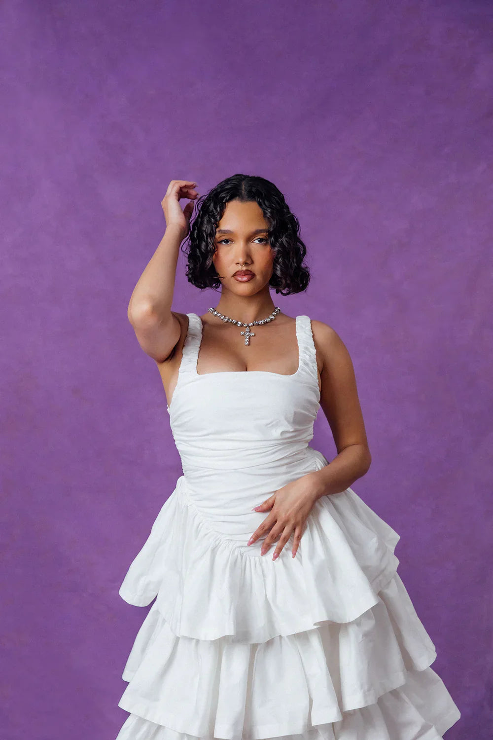 This white cotton-blend dress features a square neckline, a sleeveless silhouette, a ruched bodice, and a midi-length, tiered, ruffled skirt. Pair it with this white tiered ruffled maxi for a romantic party look.