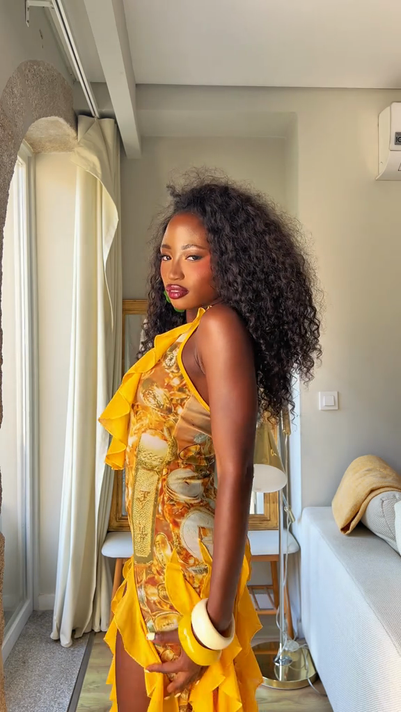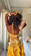The person is wearing a vibrant yellow halter dress with elaborate ruffle details. The dress features a deep V - neckline and a high side slit, revealing one leg. The bodice has a patterned section that contrasts with the yellow ruffles. Accessories include colorful bangles, a unique handbag, and green - colored shoes.