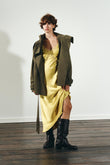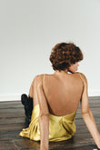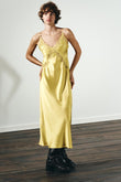 This yellow satin slip dress features delicate lace detailing along the neckline and sides, adding a touch of romantic femininity. The V-neck and slender straps flatter the figure, while the satin fabric offers a luxurious, smooth feel.